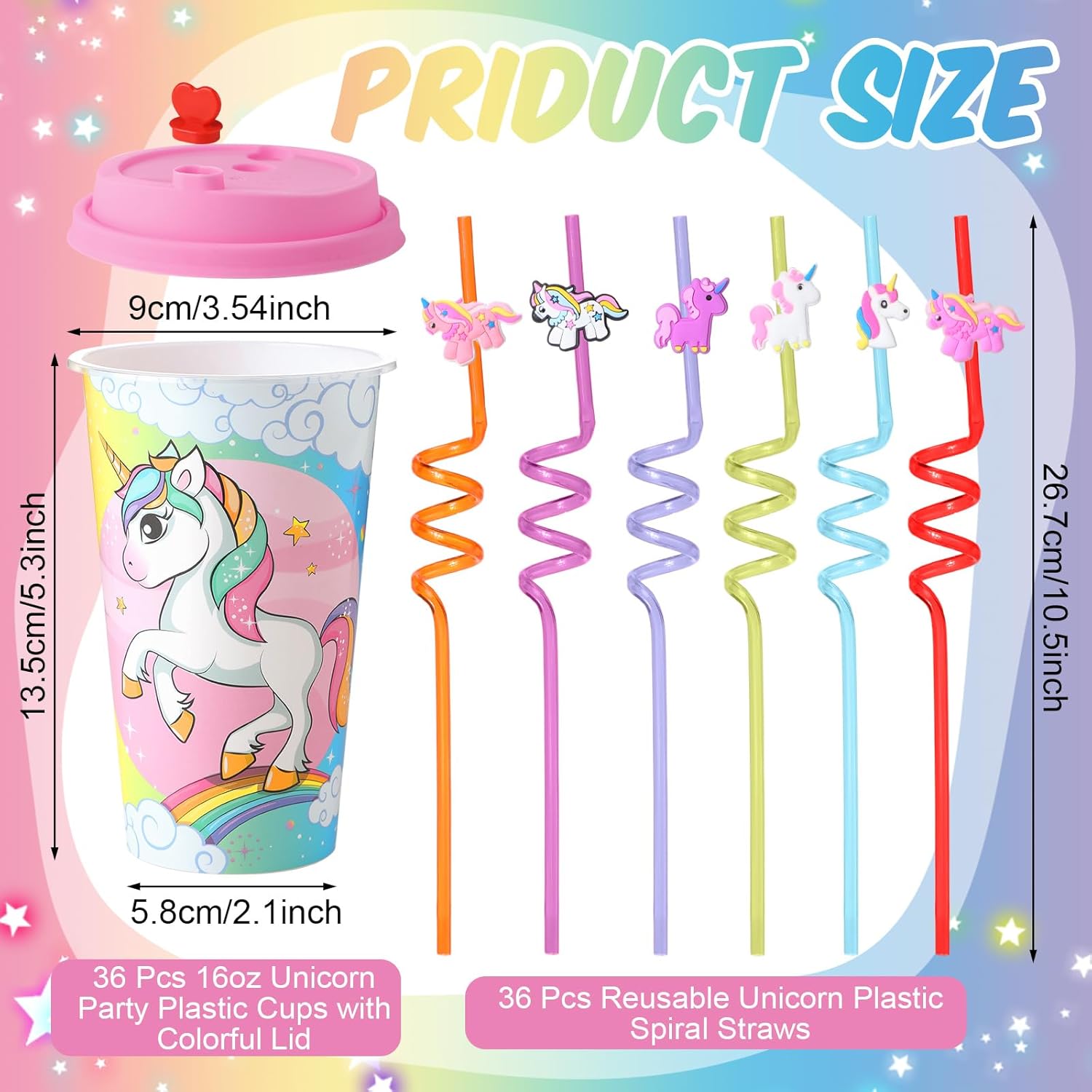 Abundant Unicorn Party Favors: revel in the charm of our unicorn birthday party supplies; Each package includes an ample amount of 36 unicorn cups for birthday party with colorful lids and 36 unicorn straws; Enjoy the fun filled festivities and step into the world of unicorns