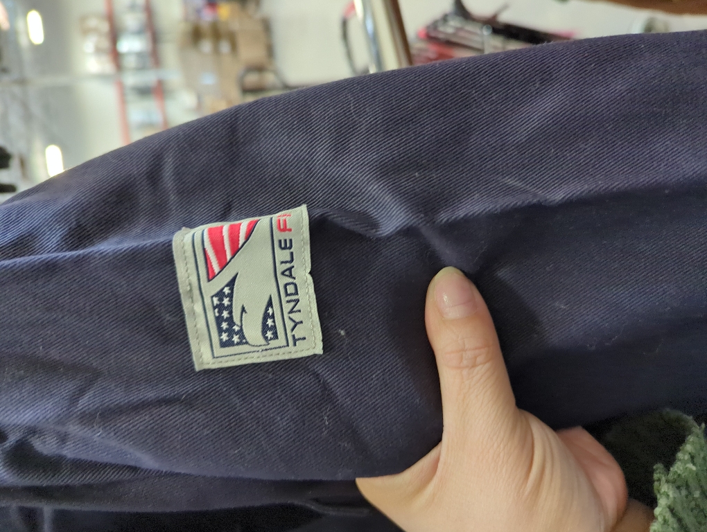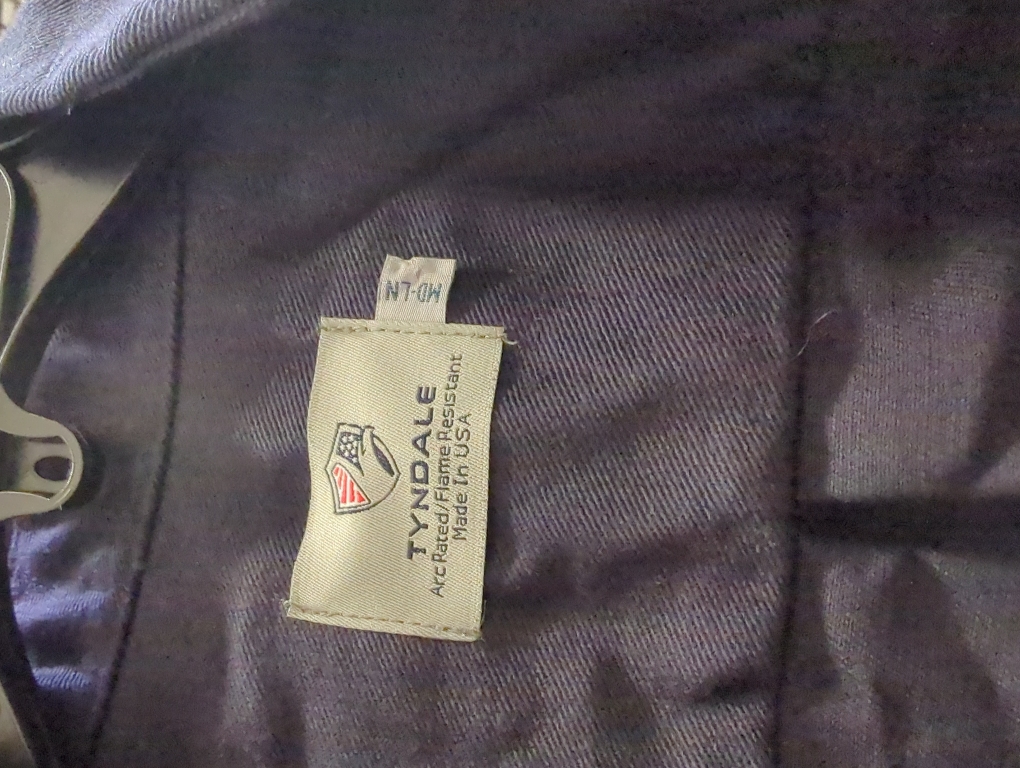 Flash fire rated-meets NFPA 2112; Exterior Tyndale FR, arc rating, and HRC labels