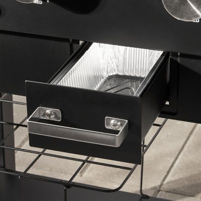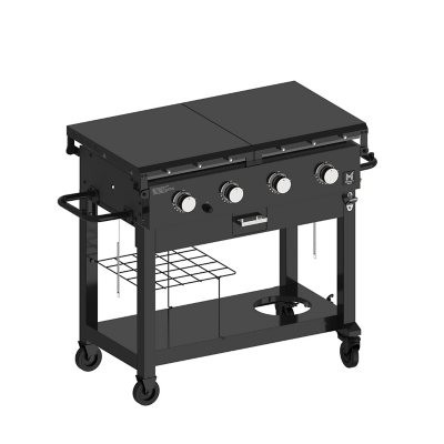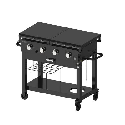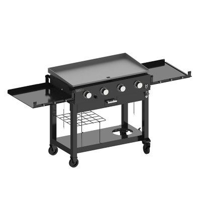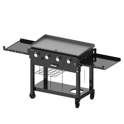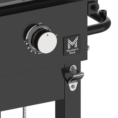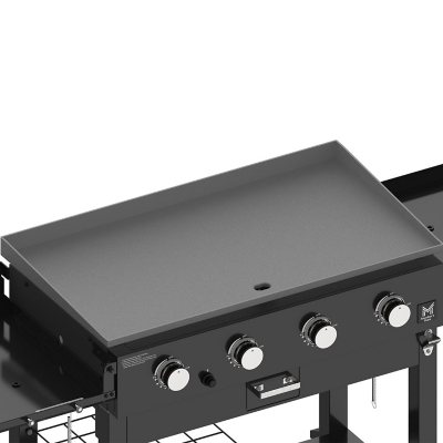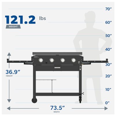 Large capacity, 720 sq. in. hot rolled steel griddle. 48,000 BTU: 4 premium, 304 stainless steel burners. Dual function side tables for prepping meals and protecting the griddle surface. Easy clean front access grease cup with replaceable foil tray. Unlock the versatility of griddle cooking with Member's Mark™ 4-Burner Gas Griddle. The 720 square inches hot rolled steel griddle surface is durable, easy to season, easy to clean, with ample space to prepare full meals from breakfast to dinner. The reliable all-weather electronic ignition ignites four 304 stainless steel burners with up to 48,000 BTU, for even and consistent griddle surface temperatures offering the range of temperatures you need to cook just about anything. This griddle is loaded with convenient features like tool hooks, towel bars, a large capacity, front-mounted grease-catch for managing and removing grease, two oversized side tables that offer lots of space for preparing meals and that fold-over and cover the surface for more compact storage and griddle surface protection. With heavy duty easy mobility casters, a custom all-weather griddle cover and a griddle scraping tool, this Member's Mark 4 Burner Gas Griddle is the best value in the market. Why does a griddle require seasoning? Seasoning is the process of applying multiple coatings of oil to the griddle surface and heating oil to a high temperature to bake the oil into the griddle top. This will create a slick, non-stick surface that is blackened and will protect the griddle surface from deterioration caused by rust and oxidization. Can the fold-over side tables be used during cooking? No. The fold-over side tables should only be used for storage after the griddle has cooled down. Never use during cooking. If coverage is required in use, use a melting dome. When should a griddle be seasoned? 1) Before first use, 2) Before and after each use, 3) when the griddle surface is dry or discolored, 4) if food begins sticking to the surface, and finally 5) if the appearance of rust is evident. How to protect the griddle surface from corrosion? Building and protecting the seasoning on your griddle surface is the first thing every user must focus on if they want the griddle surface to remain rust/corrosion free. Focus on following proper seasoning instructions as outlined in the manual, and watch closely for signs that the seasoning is wearing off. For example: if the griddle surface looks dry, food is sticking, or discoloring surface. Users must also always fold over the side tables after the griddle has cooled, to keep rainwater and snow from the griddle surface, and always covering with the all-weather cover included, and storing away from the elements when possible. What to do if you see rust? Use a griddle or pumice stone to remove any surface rust/corrosion immediately, clean and dry the surface and perform a full re-seasoning of the griddle surface. Rust/Corrosion can be avoided with attention to seasoning, and proper storage. Rust/Corrosion can be removed, cleaned and the griddle brought back to life with a full re-seasoning. The end user must perform these steps to protect their investment and ensure a long life for their griddle. Why is my ignition not working? The Member's Mark 4 Burner Griddle includes an electronic ignition kit that requires a battery to operate. The first step in troubleshooting ignition issues is making sure you are following proper lighting procedure. The second step is changing the battery. The third step is checking to ensure that all lead wires are connected to the electronic ignition module correctly. See the Troubleshooting Chart in your manual for assistance.