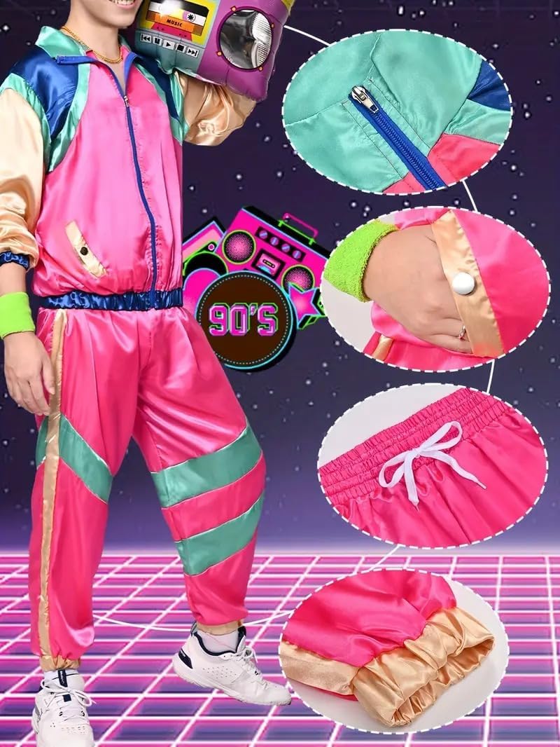【Feature】: Womens Men 80s Hip Hop Costumes Tracksuit Outfit Color block Design, The Retro Jacket With A Practical Zipper, The Pants With Elastic Band And Pocket. 80s Disco Costume Men, Elastic Waistband Of The Pants Is For Easily Putting On Or Off. The Costume Comes With A Headband To Compete The Look. Perfect Look Pullover, The Retro Tracksuit Costume Will Bring You Back To 80s AMSer Dressing It Up, And You Will Be The Hit Of The Party. To Pair With A Retro Sunglasses.