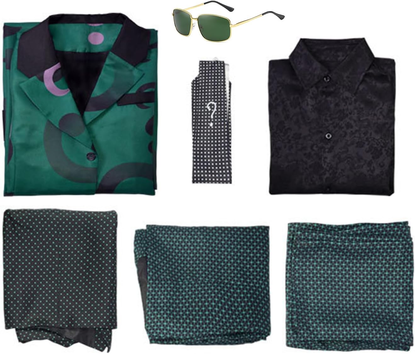 Adult Mens XL NO SUNGLASSES The Riddler Cosplay Costume Question Mark Trenchcoat Waistcoat Jacket Shirt Pants Green Uniform Suit Gentlemen Halloween Cosplay Outfit Full Set. About Size: Standard US Men's Size. Please check our size chart in the product description carefully when place the order. Package include: As shown in the picture. Occasions: Riddler Cosplay Costume Suitable for leisure, Halloween cosplay, dress up, theme party, Masquerade, role play, stage performance, carnival, photography, daily life,etc. For any quality, size or other problems, we provide free return or exchange service.