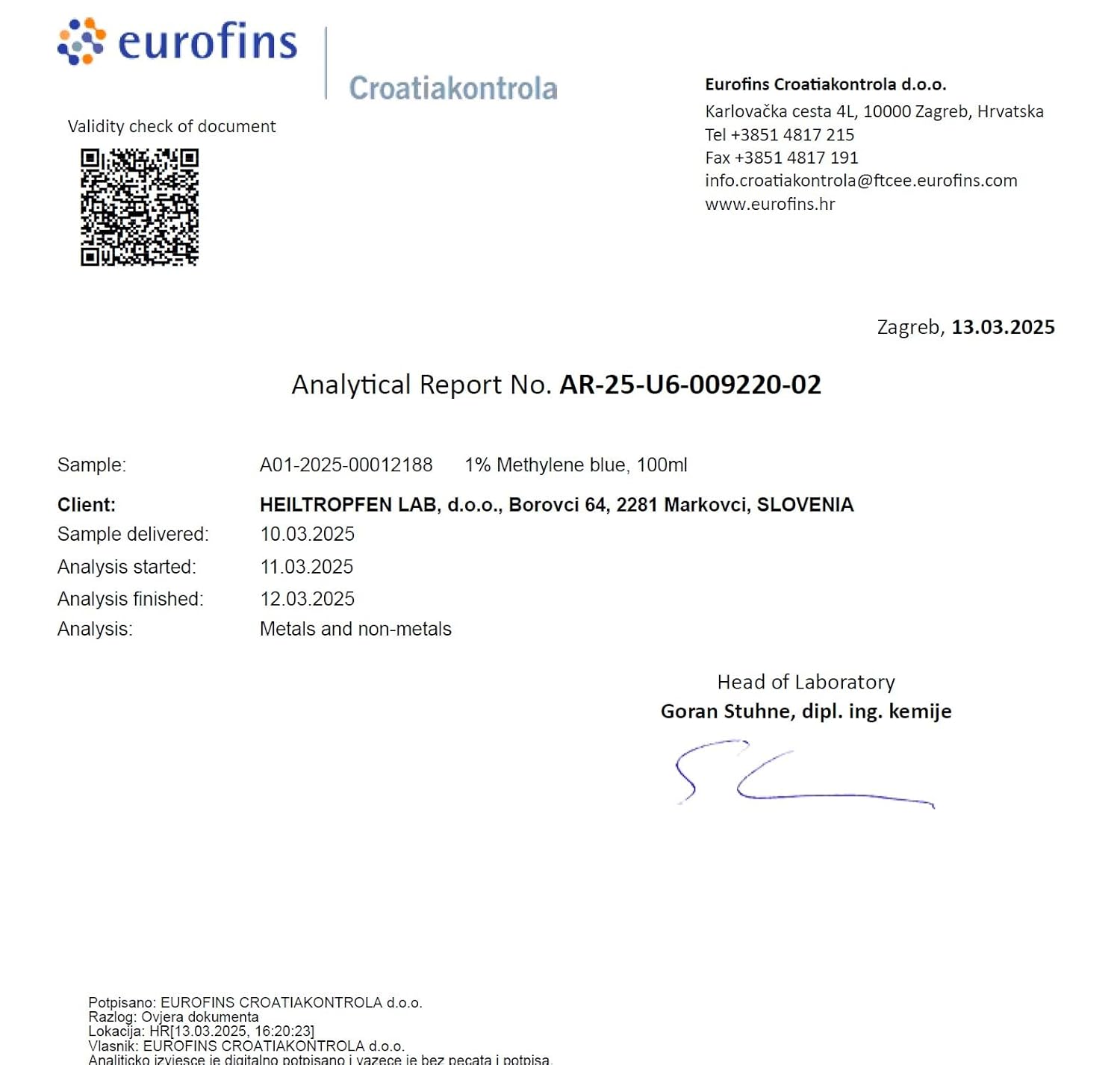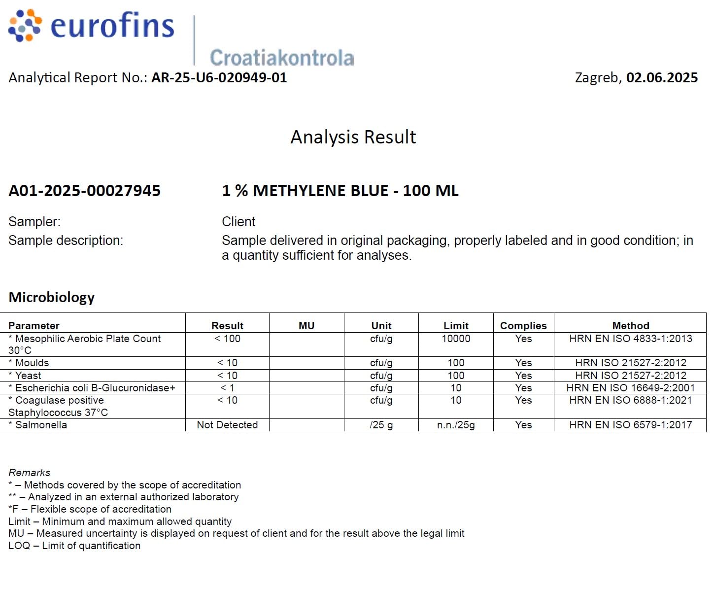 Third-Party Tested for Heavy Metal Contamination and microbiology. Upon request, a heavy metal analysis and microbiology analysis will be provided. Our product meets and exceeds USP requirements. Third-Party (USP) United States Pharmacopeia verified methylene blue incl. certificate.