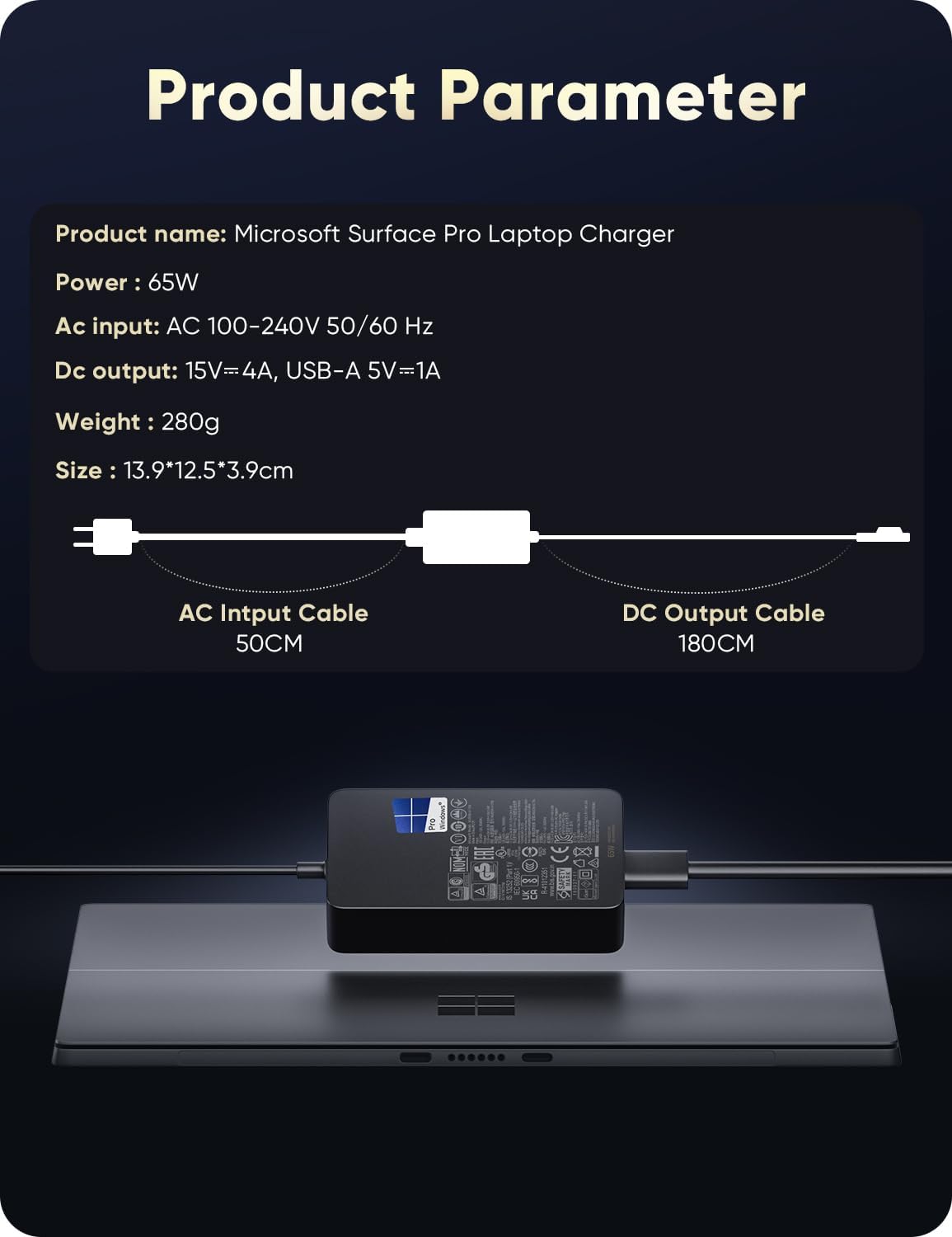 Broad Compatibility: Our charger is designed to work seamlessly with a wide range of Microsoft Surface devices, including Surface Pro 11, 10, 9, 8, 7 , 7, 6, 5, 4, 3, X, Surface Studio 1 i5, Windows Surface Laptop 6, 5, 4, 3, 2, 1, Surface Book 3, 2, 1, and Surface Go 3, 2, 1.