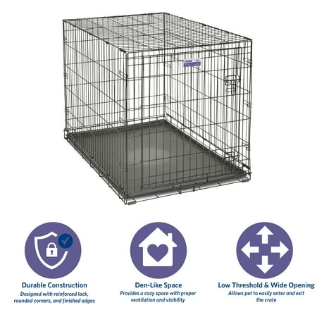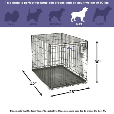 Newly enhanced with added security features to keep your pet safe Dog crate includes a divider panel, durable & leak-proof plastic pan, protective rubber feet, and carrying handle. Slide-bolt door latches now feature patented Paw Block and locking tips to create a safer, more secure home for your pet. Dog crate sets up in seconds with no tools required and conveniently folds flat for travel. Durable & strong, quality construction creates a secure place for your dog to fulfill their natural instinct to den. Proper ventilation, large door openings with low thresholds, and patented rounded corner clips make iCrate a safer crate experience for your dog. iCrate single door dog crate measures 42L x 28W x 31H inches and is suitable for large dog breeds with an adult weight of 70-90 pounds. If your dog’s weight or measurements are on the higher side for this crate, we recommend buying the next crate size up. When in doubt, bigger is better. Easy to assemble & portable. Family Owned for Over 100 Years!