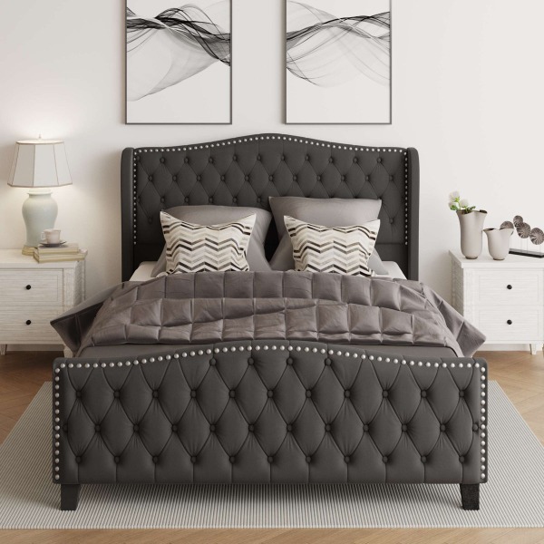 Mieya Velvet Upholstered Platform Queen Bed Frame with Button Tufted Wingback Headboard and Footboard Black