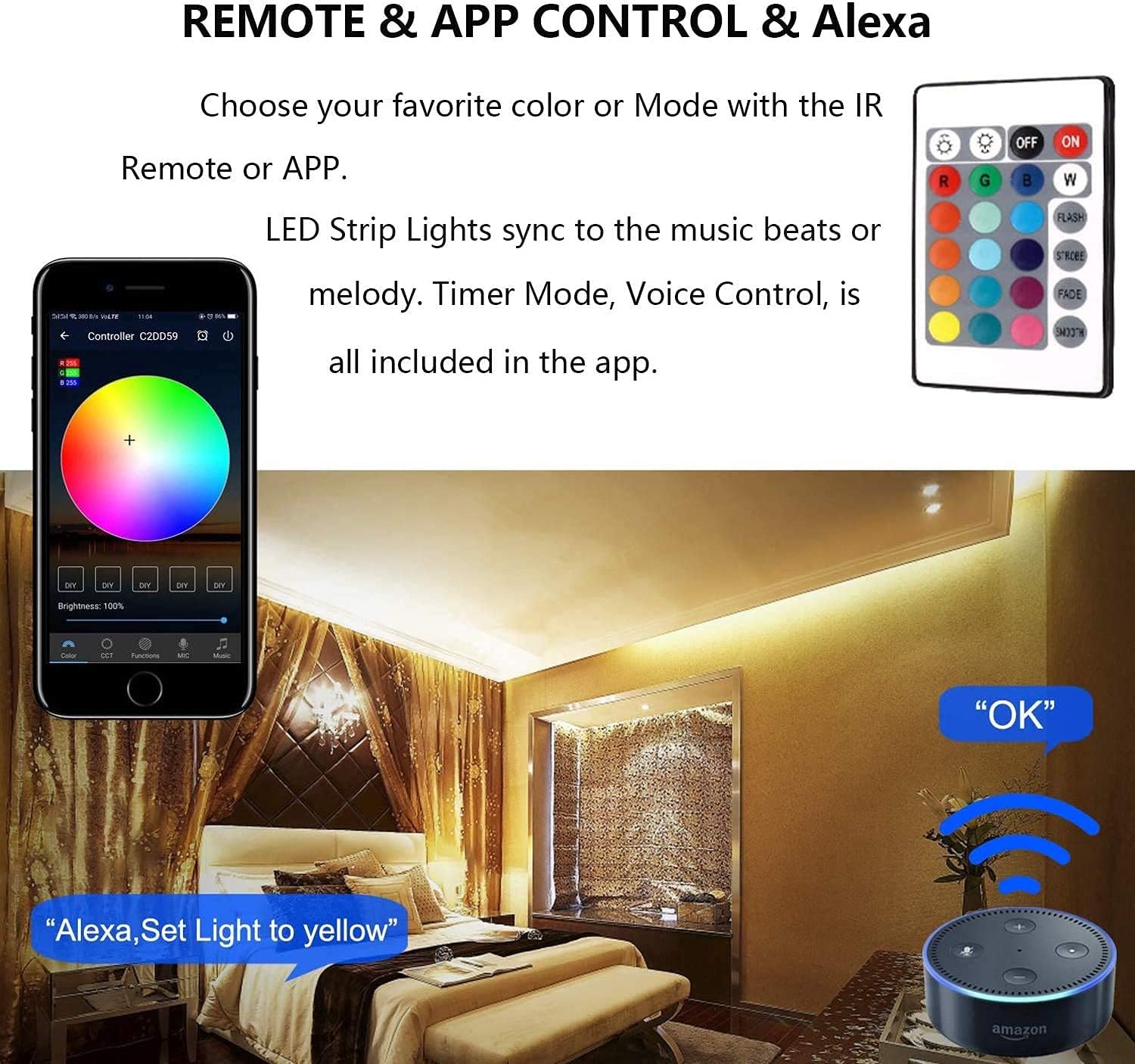 【Smart】You can connect the LED strip light to Alexa/Google Assistant, and control the light strip through voice. Without your hands, you can turn the lights on/off, set the colors, adjust the brightness and implement more functionality via simple voice commands. Smart lights strip realize your smart home and create a humanized life.