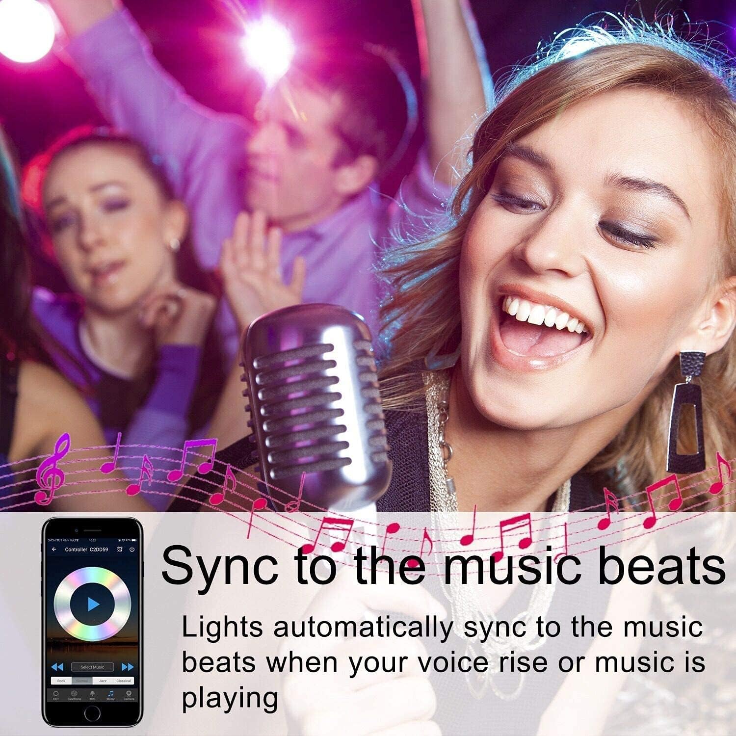 【Fun】The strip lights have smart music mode. Lights color and mode will change with the music beats or sounds, which creating vivid, relaxation, party ambiance with Music. Have fun with DIY feature, use limitless imagination to create your own colors. You can use them to decorate the ceiling, stairs, cabinet, living room, bedroom, bar or anywhere (indoor use). Widely used in party or holidays decoration.