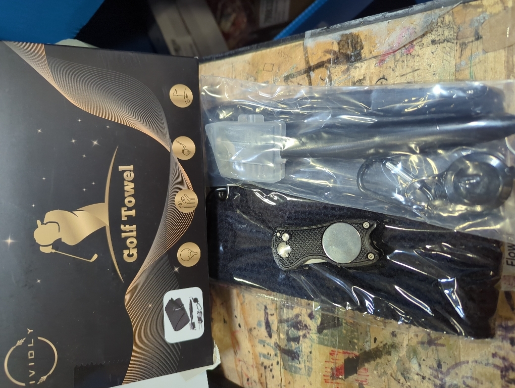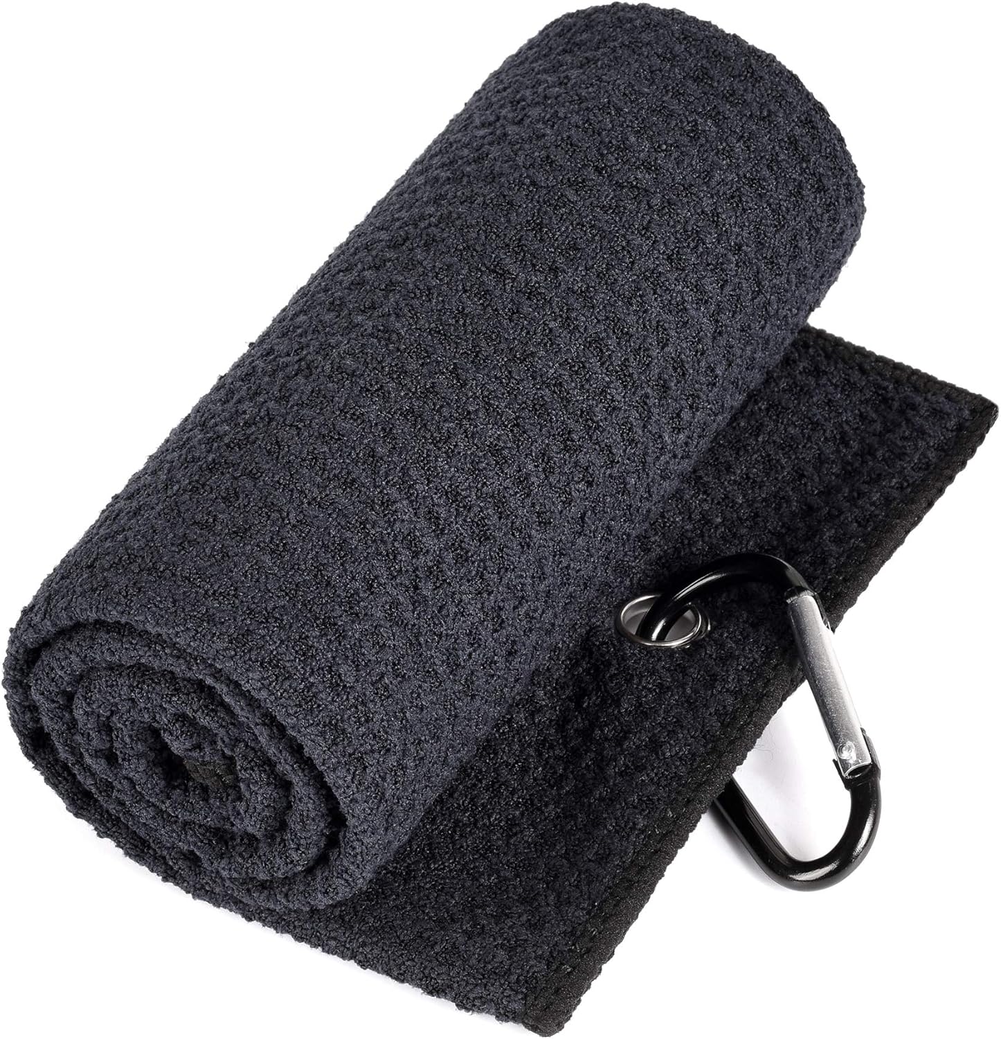 TOWEL:Tri-fold Microfiber with waffle design removes dirt, mud, sand and grass better than cotton towels. Size 16” x 21” with a heavy duty aluminum clip/carabiner that conveniently attaches to your golf bag.