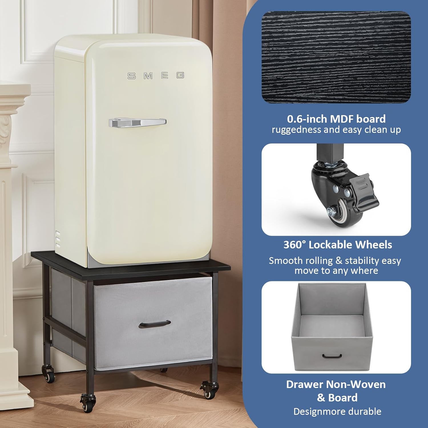 【STABLE CONSTRUCTION】:Made of high quality steel and mdf panels, It is strong and durable to hold the mini fridge securely without wobbling or tipping over. We use steel attached to the panels to ensure the stability and the weight capacity of 180 Lbs (80 Kg), use locking wheels to keep the stability and mobility at any time.The design makes it great weight capacity and great durability