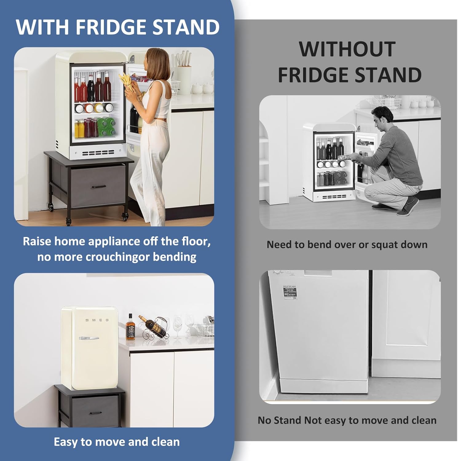 【WIDE RANGE OF APPLICATIONS】:This mini fridge stand with storage is your Ideal choice for mini fridges, microwaves,coffee makers and so on.This refrigerator stand with storage raises your mini fridge to a suitable height, reducing bending and squatting, protecting your back and knees!
