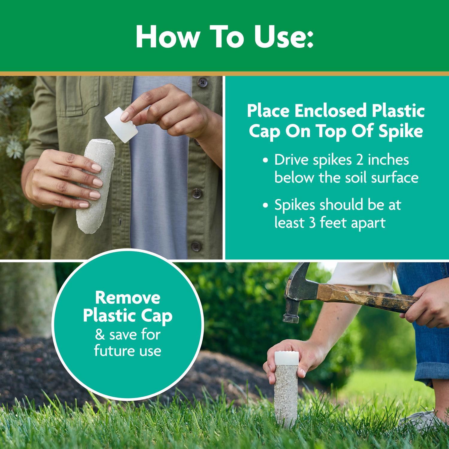 Feed your biggest and most impressive plants - your trees! - with Miracle-Gro Tree & Shrub Plant Food Spikes. These plant food spikes contain natural ingredients, and provide nutrition directly to the roots where trees need it most. In addition, these tree fertilizer spikes promote vibrant color and foliage. For use with deciduous, flowering, and evergreen trees and shrubs, these plant food spikes are also great for acid-loving plants. Apply once a season in spring and fall for best results. To use, place the enclosed plastic cap on top of the spike and drive it into the ground around the tree or shrub following the drip line (as shown in the label illustration). Remove the plastic cap and continue to drive the spike 2 inches below the soil surface. Spikes should be placed at least 3 feet apart. For small trees and shrubs with a drip line closer than two feet, insert spikes two feet away from the center of the tree or shrub. This package contains 12 Miracle-Gro Tree & Shrub Plant Food Spikes.