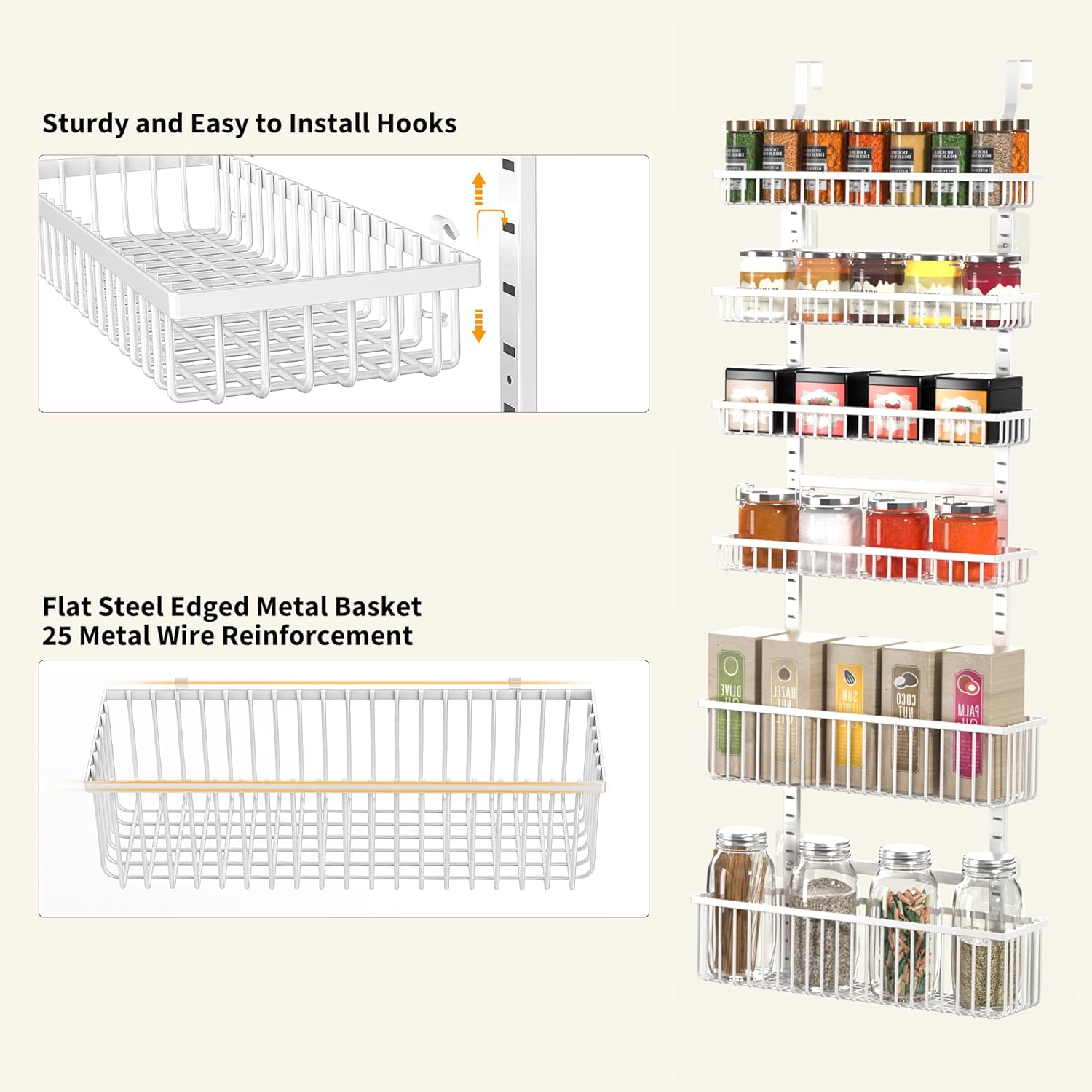 Maximize Your Space: Our 6-Tier over the door pantry organizer is designed to make the most of your storage space, allowing you to store more items in a smaller area such as spice and some jars. Perfect for small kitchens or those with limited storage space.