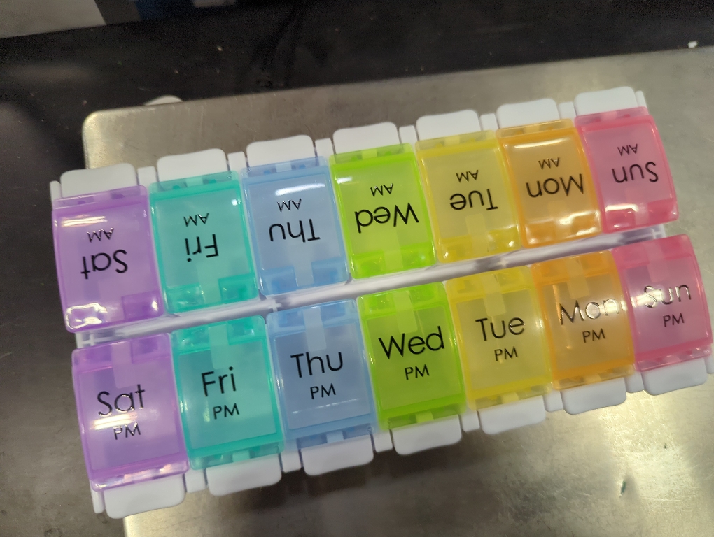Two Rows with AM/PM Labels: The compartments are labeled with AM and PM symbols, making it easy to track which pills need to be taken at which times. The pill organizer consists of 2 rows that can detachable from the base plate, you can take one of them with you instead of the whole pill organizers.