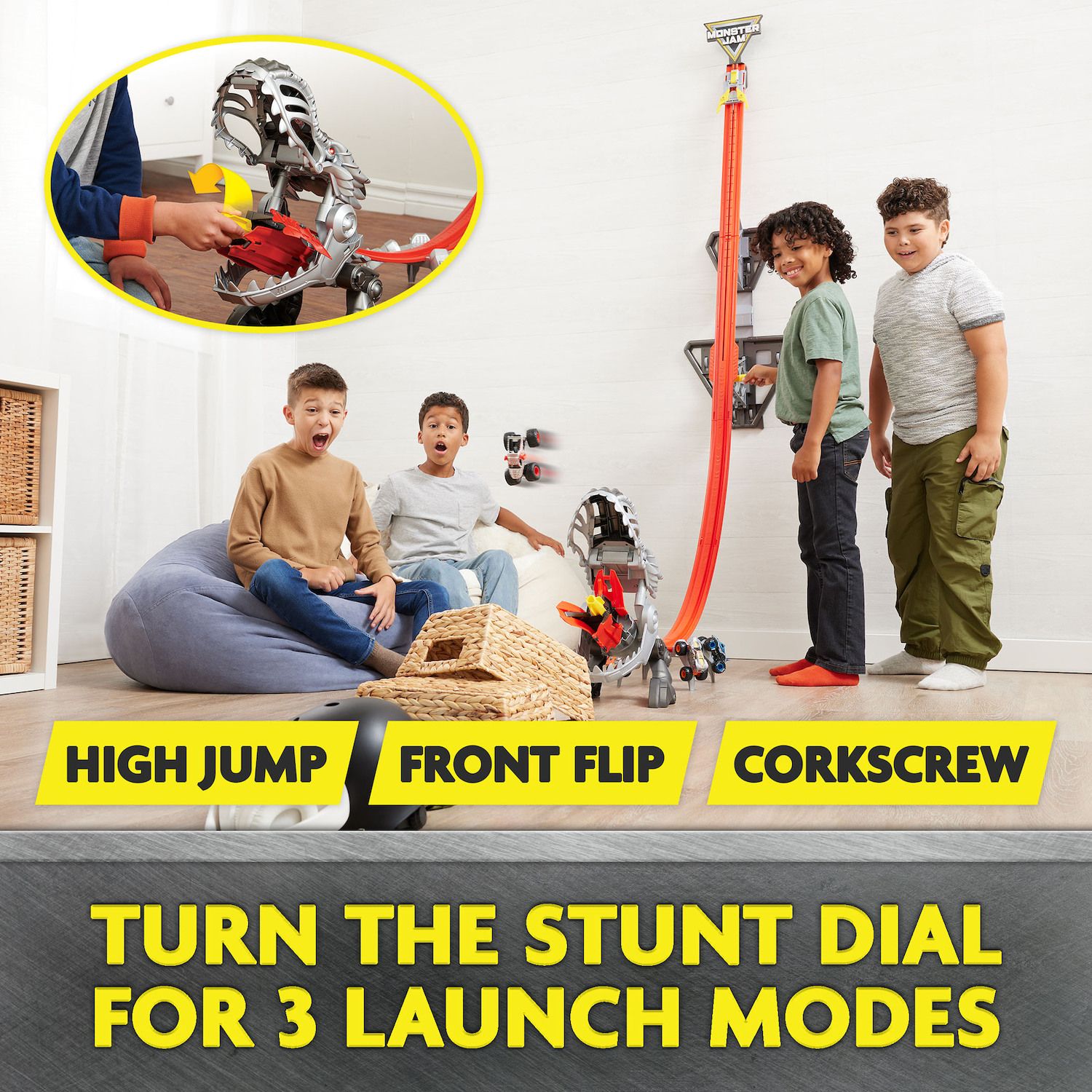 - 3 LAUNCH MODES: Load and crank your favorite Monster Jam trucks to the adjustable launch ramp. Once it reaches the top, perform awe-inspiring moves like a high jump, front flip, or corkscrew with turn of the stunt dial in the Dino's mouth.