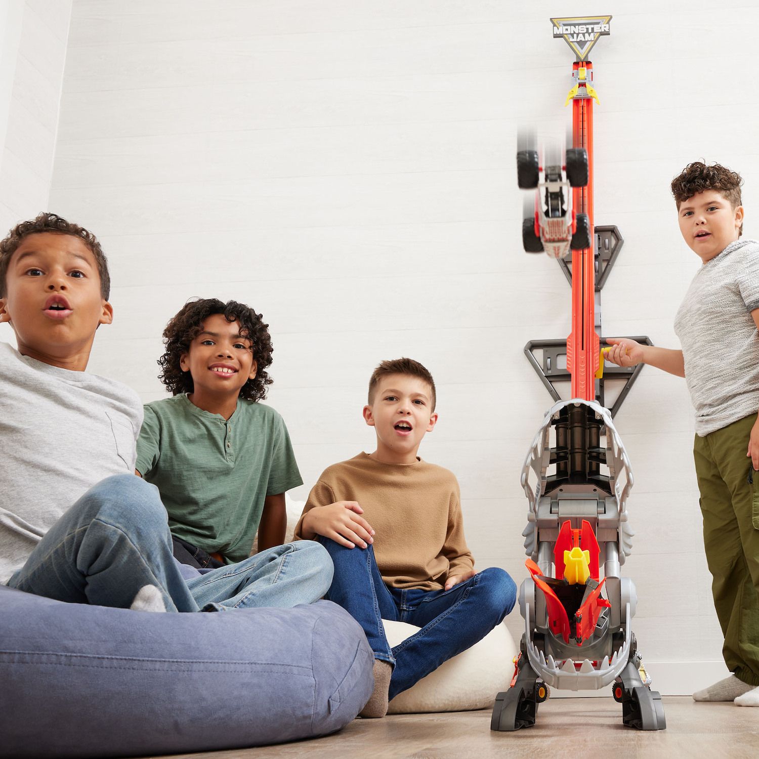 Put the Monster Jam stunts in your hands with the Monster Jam ThunderROARus Drop Playset Standing 6 feet high, this is the tallest Monster Jam playset yet. Load your Monster Jam truck and crank the handle to watch it gain height. Witness it release at the top and perform three amazing Monster Jam stunts like a high jump, front flip, and a corkscrew as it shoots out the Dino's mouth.