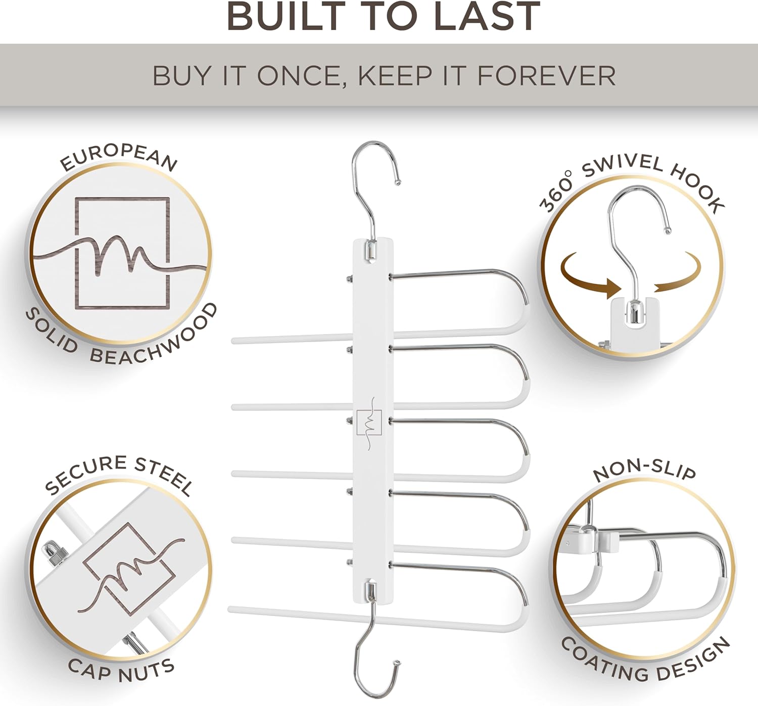 MORALVE Pants Hangers Space Saving - 2 Pack European Beechwood Scarf and Jean Hangers - Closet Organizer and Space Saver Pant Rack, Leggings Hanger, and Scarf Holder with 360° Swivel Hook