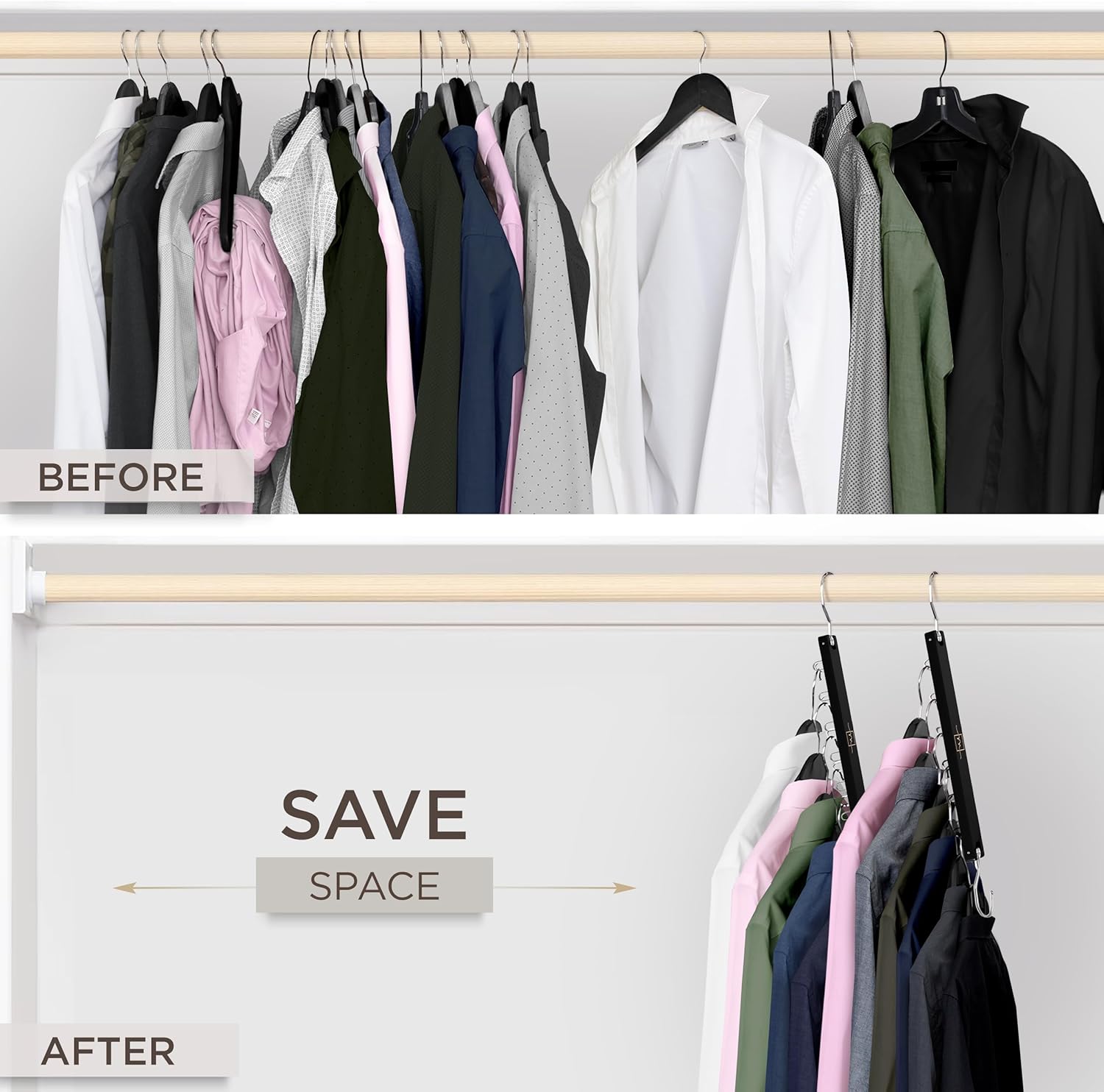 PATENTED 360 SWIVEL DESIGN - Load or unloading your items from this clothing hanger organizer is easy thanks to our 360 degree swivel hook. Our folding hangers space saving low profile design and 6 secure enclosed hooks results in a carefully crafted hanger storage that keeps clothes secure while fitting your unique closet space.
