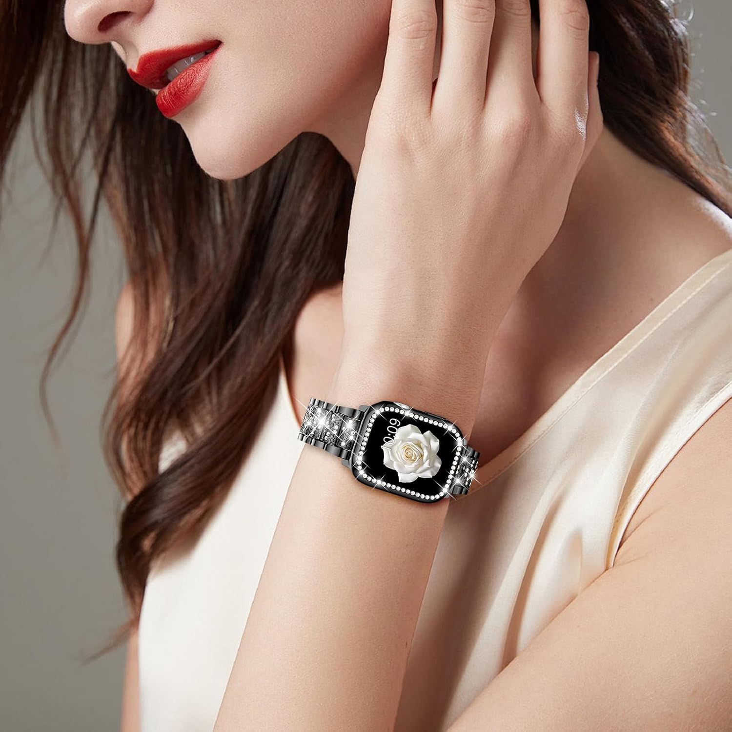 Mosonio Compatible with Apple Watch Band 38mm 40mm 41mm 42mm 44mm 45mm 46mm 49mm with 2 Pack Case Women, Jewelry Replacement Metal Bands Strap with Bling PC Protective Case for iWatch Ultra SE Series 11/10/9/8/7/6/5/4/3/2/1