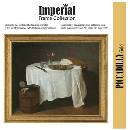 Elegant Gold Finish: Piccadilly frames feature a slim profile with a raised outer edge in brushed gold, hand-finished for timeless sophistication Premium Fir Wood Construction: Built from high-quality fir wood, molded, gesso coated, and hand-detailed to ensure strength, durability, and professional presentation Archival ZTPE Protection: Entire moulding sealed with inert archival ZTPE, preserving both the frame and your artwork with lasting museum-quality integrity Slim Profile Dimensions: Frame measures 7/8" wide, 7/8" deep, with 1/2" rabbet—ideal for 3/4" deep canvases, paper, or panel-mounted artwork Versatile & Affordable Luxury: Minimalist design enhances portraits, landscapes, or gallery work, offering a refined modern look at an affordable price