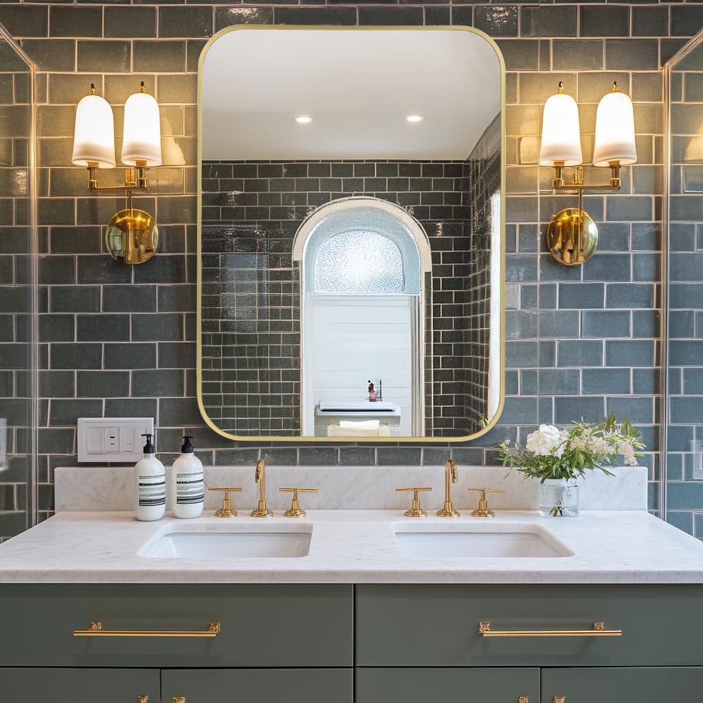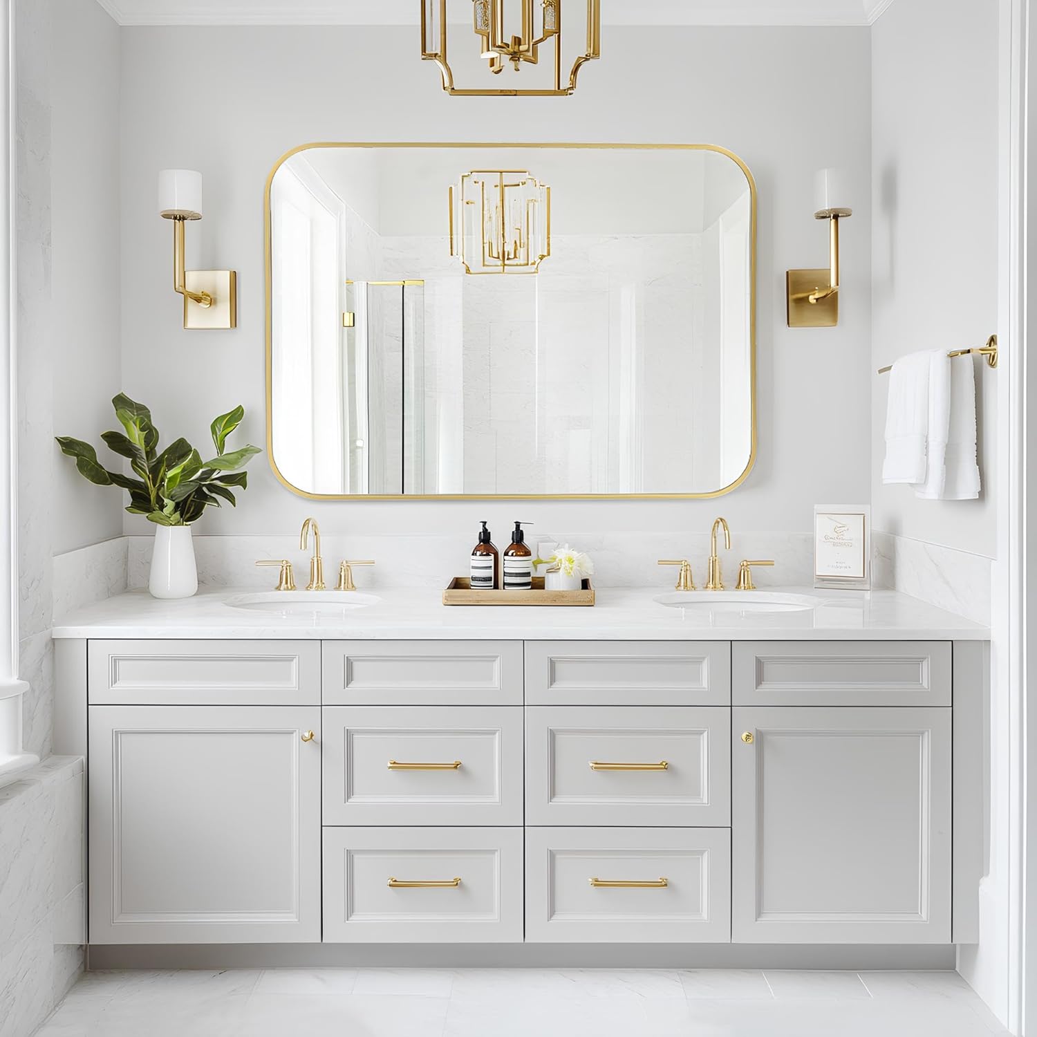 【Premium Quality & Safety】:A gold mirror with a rustproof aluminum alloy frame and a moisture-resistant MDF backboard, this modern bathroom mirror stands strong against humidity. And the shatterproof glass adds safety for families and everyday use, making this rectangle mirror be a stylish and reliable choice.