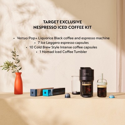 ONLY AT TARGET: Exclusive Nespresso Iced Coffee Kit including a Vertuo Pop Liquorice Black coffee and espresso machine, 10 Iced Leggero double espresso pods, 7 Cold Brew Style coffee pods and 1 Travel Collection 18.3 fl. oz. iced coffee Travel Tumbler.