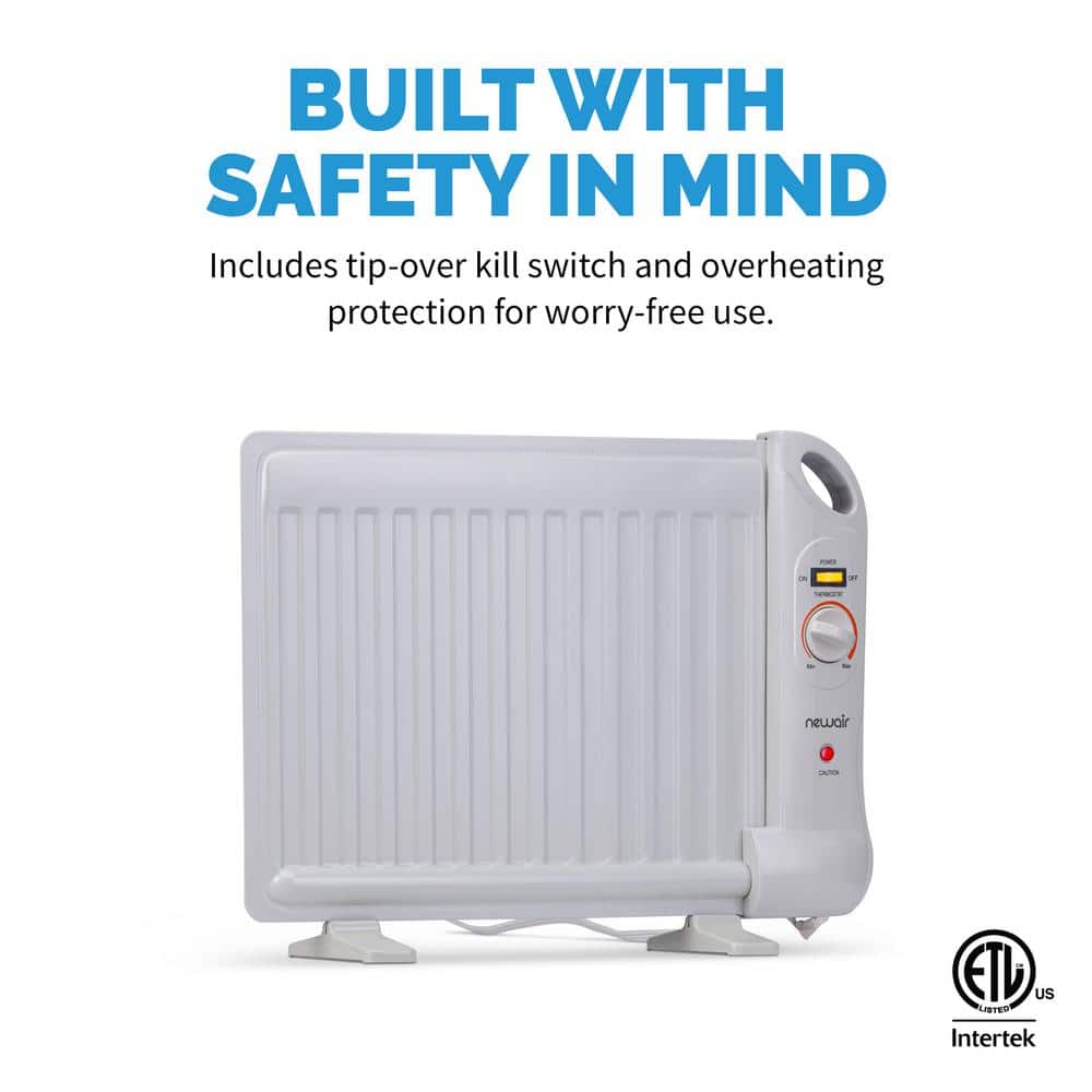 The NewAir AH-400 personal space heater can add extra warmth to your personal space in a short amount of time. It is a low 400-Watt personal heater that will get you the most bang for your buck. This particular heater is an oil filled space heater that will not trip any circuit breakers. The NewAir AH-400 personal space heater can be placed under a desk, in a corner of the room, or along the wall, and has the ability to add extra heat to an area up to 40 sq. ft. This easy to use unit is perfect for places like: Your home, under desks or in cubicles, Any small and confined space. Save Money and Energy: The NewAir AH-400 personal space heater is a low watt heater so it saves on both money and is energy efficient. This particular unit operates at a low 400 Watt which helps to maintain the optimal room temperature. It heats up very quickly so you will be the most comfortable faster. The specialized diathermic oil within the heater will stay warm even after the heater has been turned off. Adjustable Temperature Design: The NewAir AH-400 personal space heater has an adjustable thermostat that customer friendly since it is so easy to use. With the option to choose the temperature best for your home, it allows for the perfect temperature control. This unit will heat up to a 40 sq. ft. area.. COMPACT HEATER - Great for personal which heats up to 40 sq.ft.. SAFETY FEATURES - Include a tip over switch with auto shut-off. ENGERGY SAVE EFFICIENCY - Low-watt heater which saves you money. Automatic temperature control. Low energy draw. Heats 40 sq. ft.. Tip over safety switch. Power indicator light. Built in thermostat. Manual controls. Convection heating method. Unit is made of PC plastic which can hold up to 400°F and the heater itself can only go up to 230°F. Click here for more information on Electronic Recycling Programs. Amperage (A): 3.3 A. Area Heated (sq. ft.): 40 sq ft. Color: White. Color Family: Blue. Control Type: Mechanical. Fan Mode: No Fan Mode. Features: Tip-Over Safety Switch. Heat rating (BTU/hour): 50 Btu/h. Heater Type: Oil-Filled. Heating Method: Convection. Indoor/Outdoor: Indoor. Location Use: Desk,Garage,Jobsite,Living Space,Patio. Material: Aluminum. Number of Heat Settings: 1. Pack Size: 1. Portable Heater Features: Digital Display,Handle,Thermostat. Power/Fuel Type: Electric. Product Weight (lb.): 6.45 lb. Room Size: Small. Thermostat Settings: Adjustable. Voltage (V): 120 V. Wattage (W): 400 W. Certifications and Listings: ETL Listed. Cord Length (in.): 72 in. Product Depth (in.): 5 in. Product Height (in.): 16.5 in. Product Width (in.): 21 in