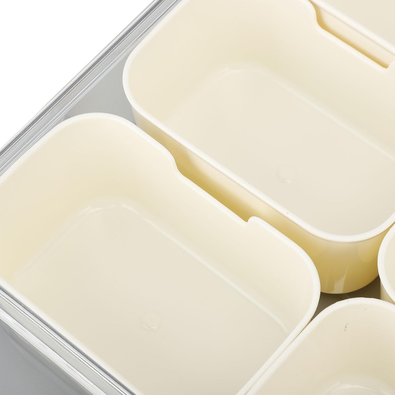 Plastic: Divided tray is made of food grade plastic, harmless, odorless, and can be used for a long time. The transparent box is made of PET; 9pcs white interior compartments and handles are made of PP.
