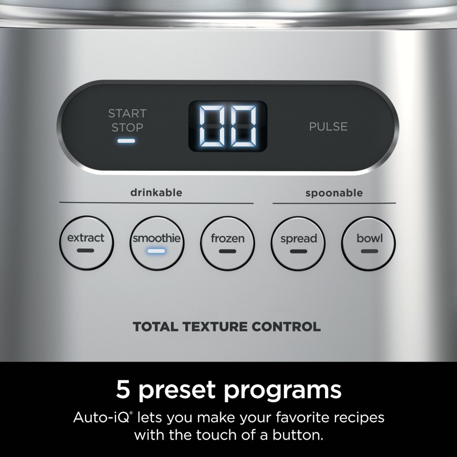 - 5 preset Auto-iQ programs for one-touch Extractions, Smoothies, Frozen Drinks, Spreads, Bowls.