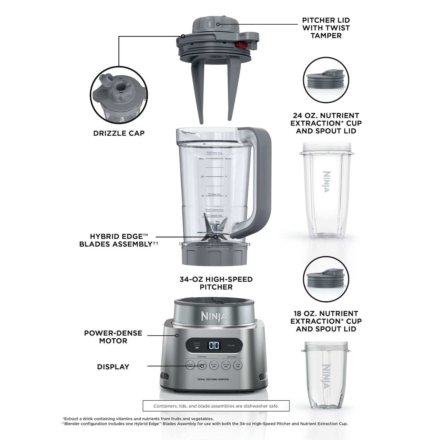 - 1600-watt motor base, pitcher lid with Twist Tamper and drizzle cap, 34-oz. high-speed pitcher, Hybrid Edge™ blades assembly, 18-oz. Nutrient Extraction single-serve cup and spout lid, 24-oz. Nutrient Extraction single-serve cup and spout lid, Recipe Inspiration Guide