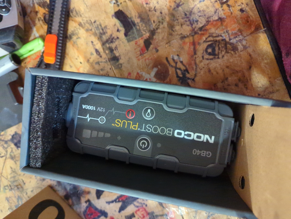 WHAT’S IN THE BOX — GB40 jump starter, heavy-duty clamps, USB-C charging cable, and microfiber storage bag.