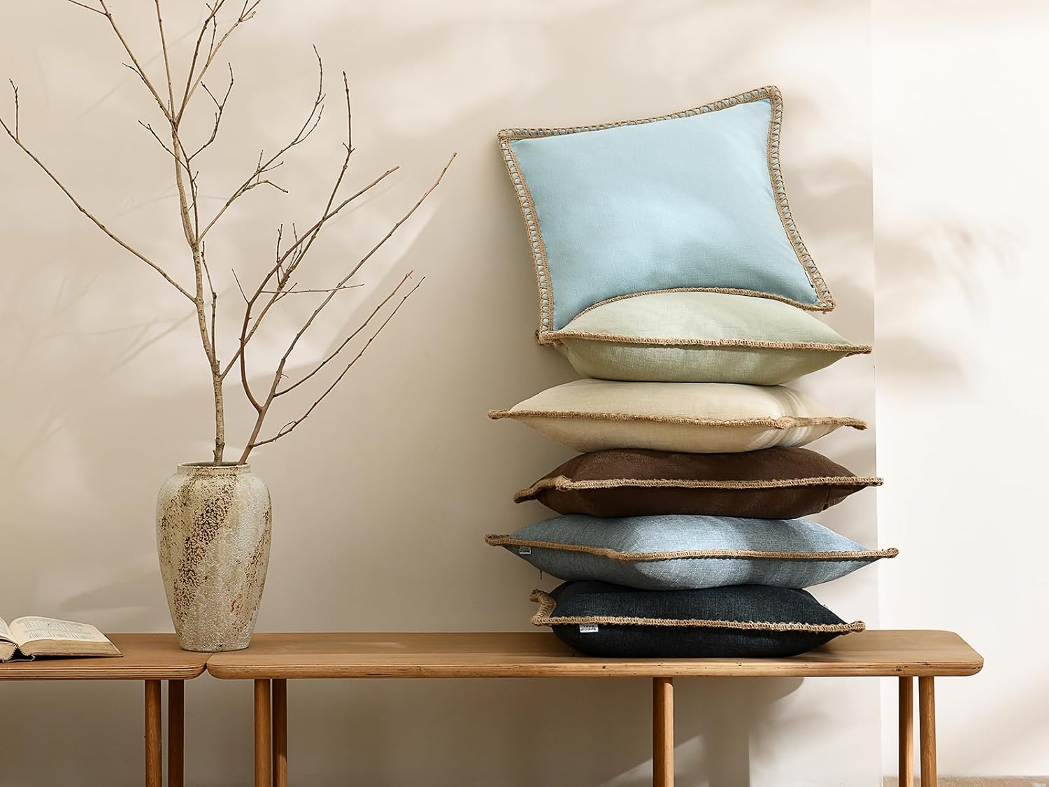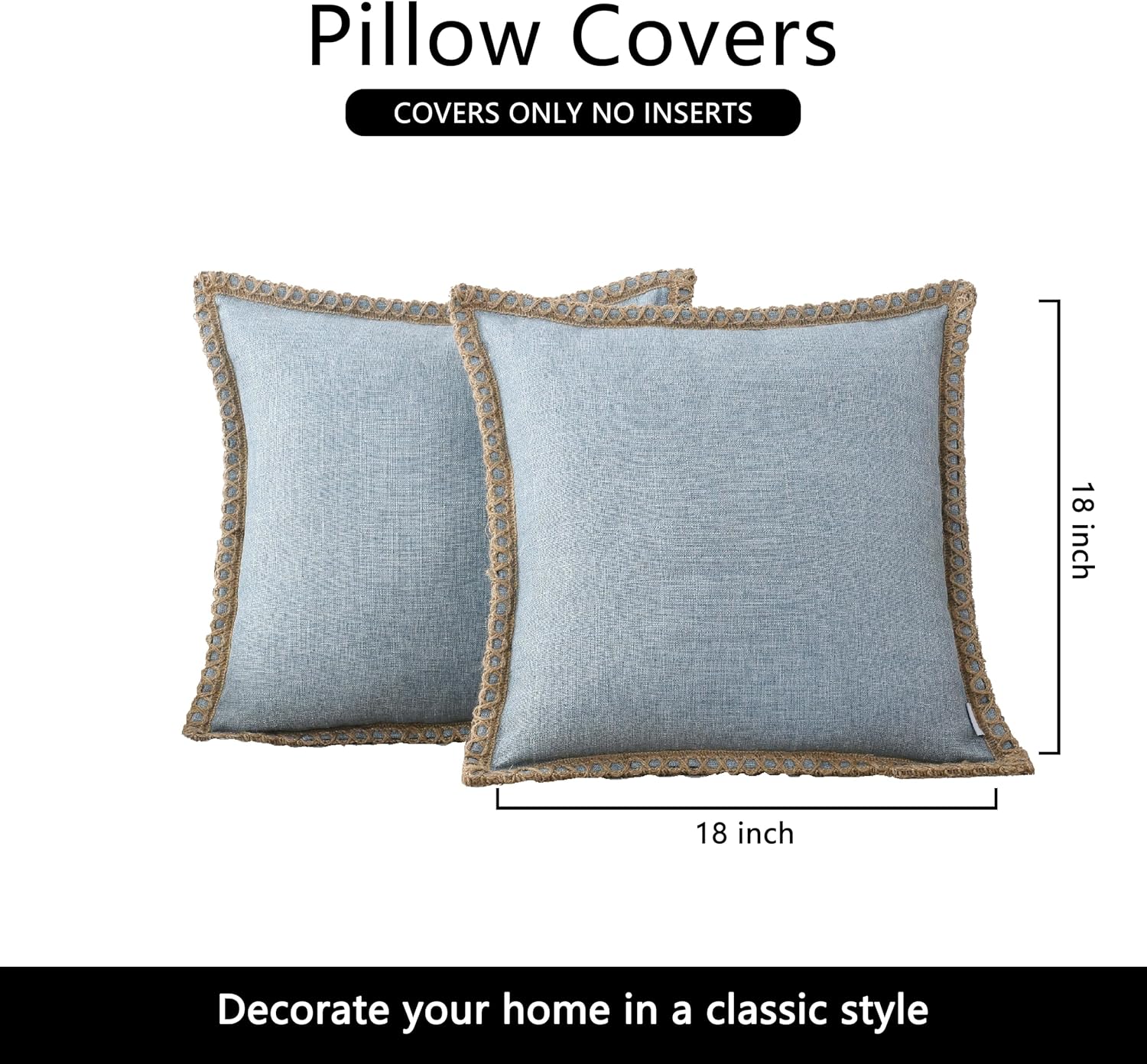NordECO HOME Set of 2 Farmhouse Throw Pillow Covers - Burlap Linen Trimmed Tailored Edges Decorative Cushion Covers for Bed Home Decoration, 18 x 18, Blue