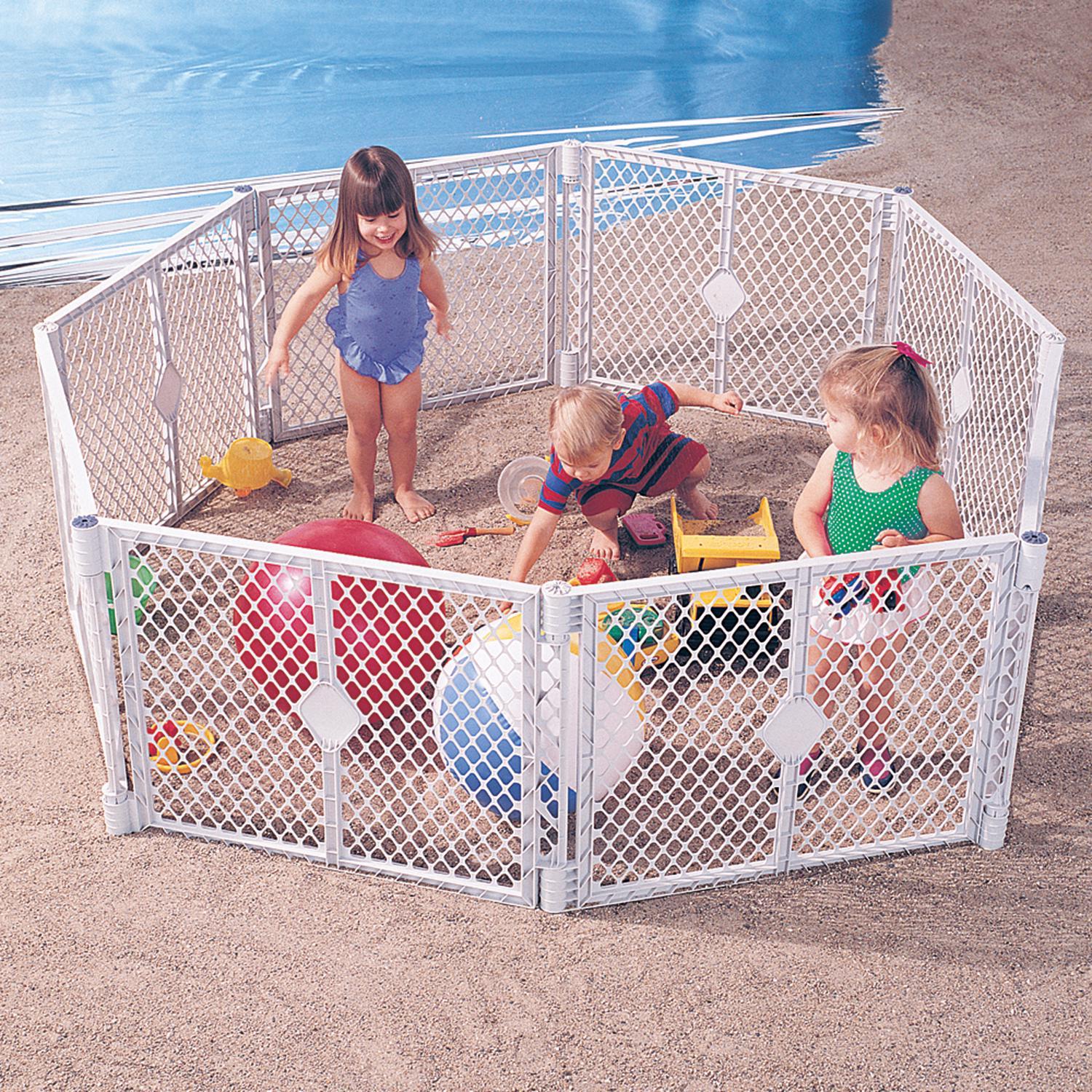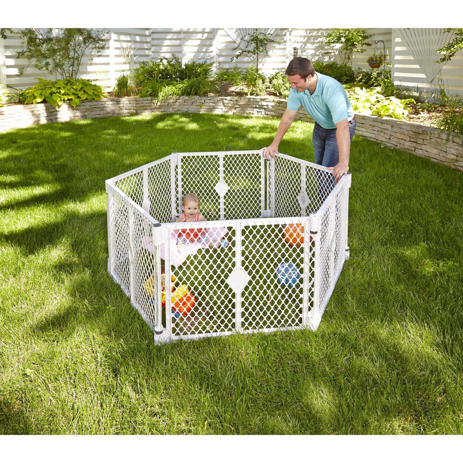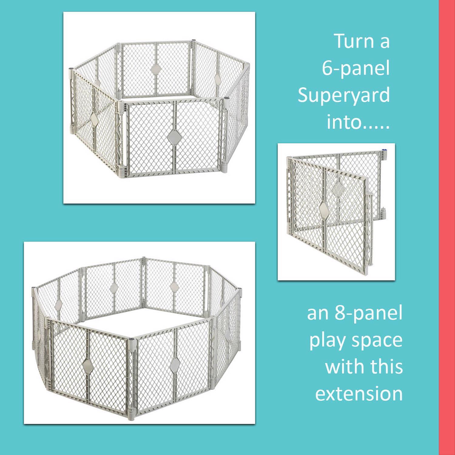 Your big girl or boy wants to have fun and the Toddleroo by North States Superyard classic is an excellent solution for creating a safe and engaging play area anywhere-inside or out. The high-quality, six-panel yard encloses up to 18.5 square feet and is 26 in. high. Setting up the Superyard classic is easy, the six interlocking panels are pre-connectedâsimply pull the panels out of box, unfold and connect them together. Comes complete with skid-resistant pads, won't slip or scratch, works on any surface. The Superyard includes a convenient carry handle which makes this lightweight yard easy to bring the fun with you. To increase the play area, a Two-Panel Extension is available separately. Toddleroo by North States products are solidly constructed from the highest-quality materials to withstand rigorous day in, day out use. Every Toddleroo by North States play yard is JPMA and ASTM certified. It's the perfect solution for homes with open floor plans or large spaces that need blocking off.