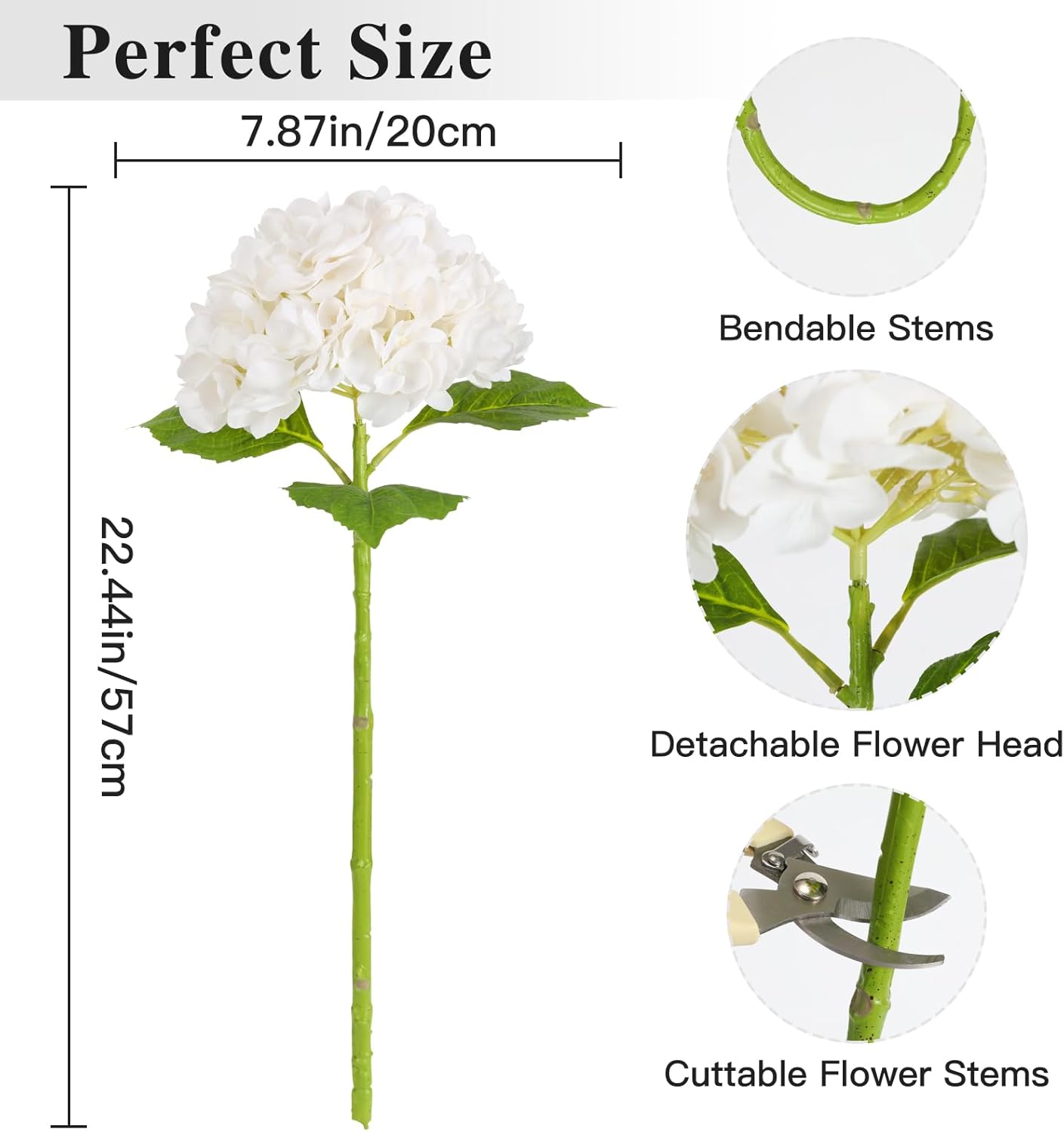 SIZE & QUANTITY:The total length of each artificial hydrangea flowers is 21.23 inch/57 cm,the fake hydrangea head diameter is 7.87 inch/20 cm and has 3 leaves.The box contains: 4 hydrangea heads,4 thick stems