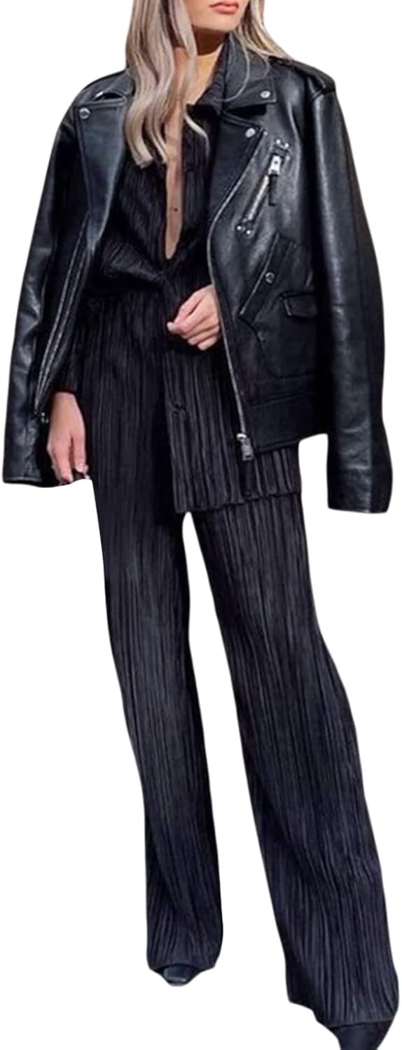 Style: Summer casual 2 piece outfits set, wide leg pant romper jumpsuit, vintage y2k 90s streetwear, long sleeve blouse and pant tracksuit set, high waist baggy pants set.
