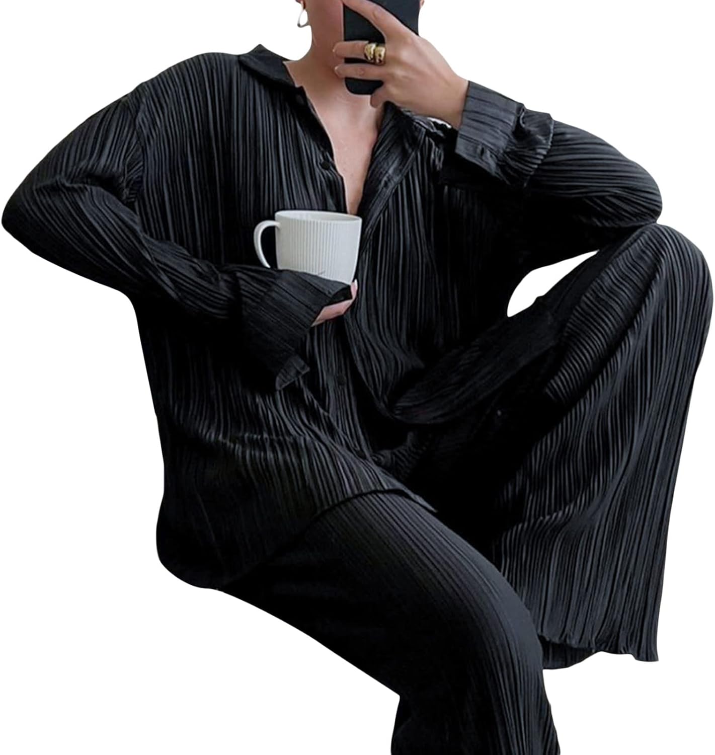 Features: Button down shirts and pants two piece sets, label collar, V neck, floral printed/ solid color, oversized style, ruched design, wide leg pants, straight leg, high elastic waistband.