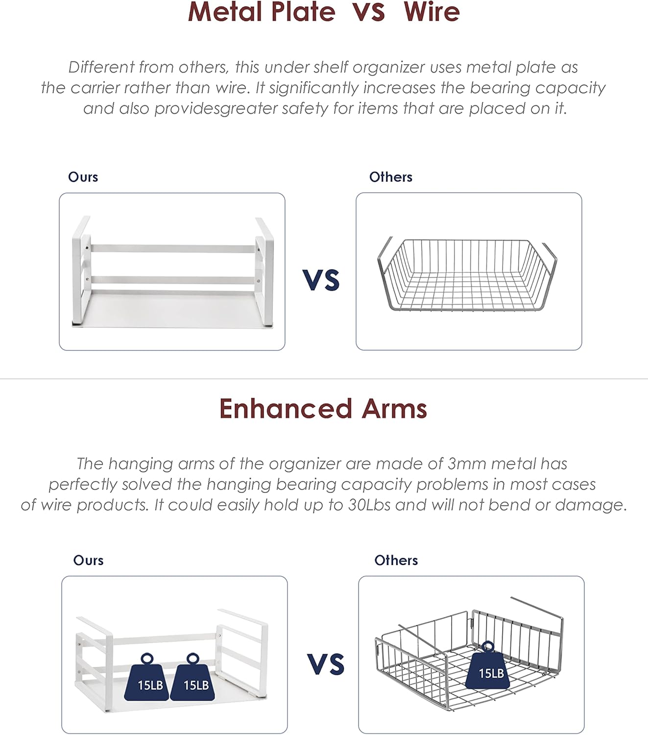Great Structure: It could hold up to 30Lbs due to this under shelf basket uses metal plate instead of flimsy iron wire, which vastly enhance its bearing capacity. Thickened hanging arms uses 3nm metal increase the whole stability of basket, prevent it from falling. It has rust-proof coating. It’s heavy duty and for lifetime of use.