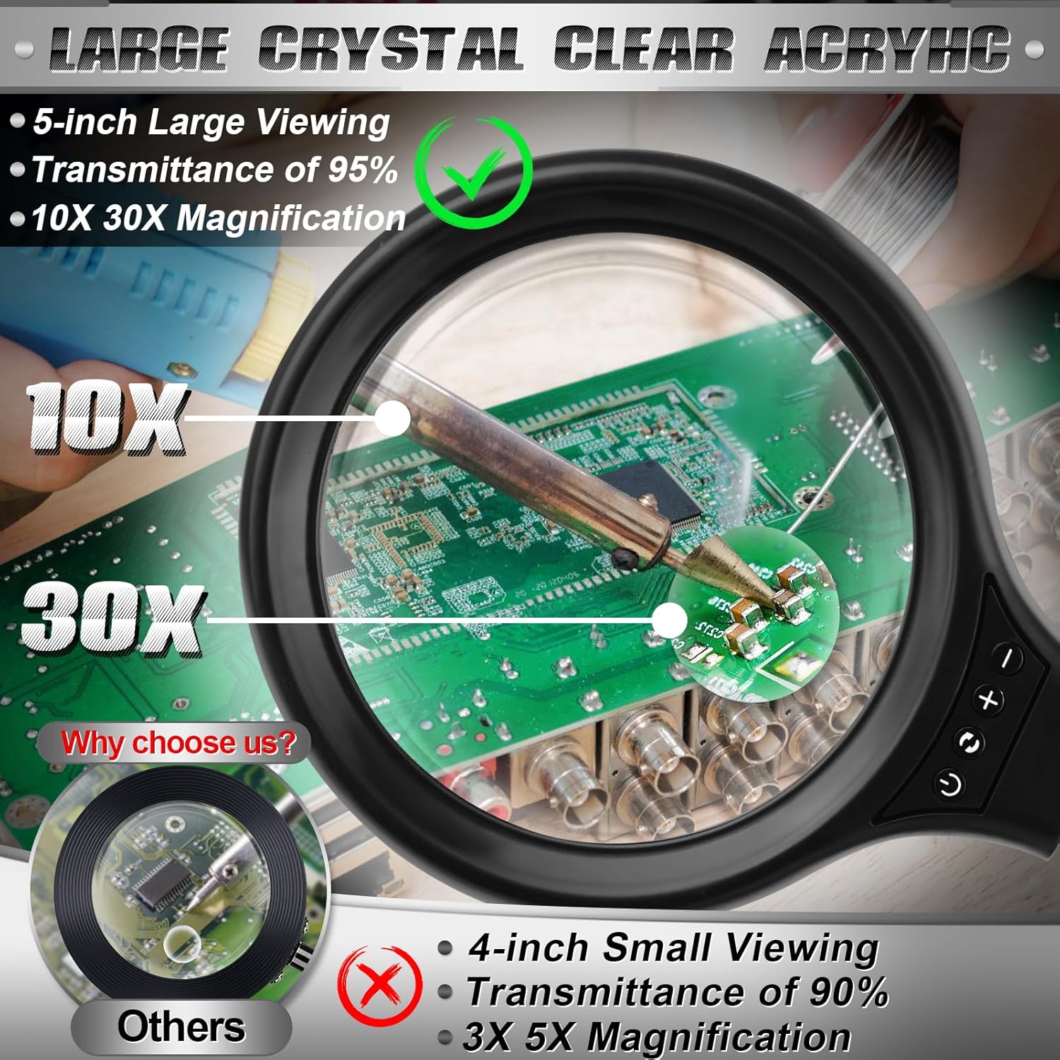 10X 30X MAGNIFICATION LIGHTS: Crafted from crystal-clear acrylic offers stunning clarity and 10X, 30X magnification. Ideal for detail-oriented enthusiasts— reading, painting, crafting, jewelry, cross-stitching, manicures, diamond painting, repairs