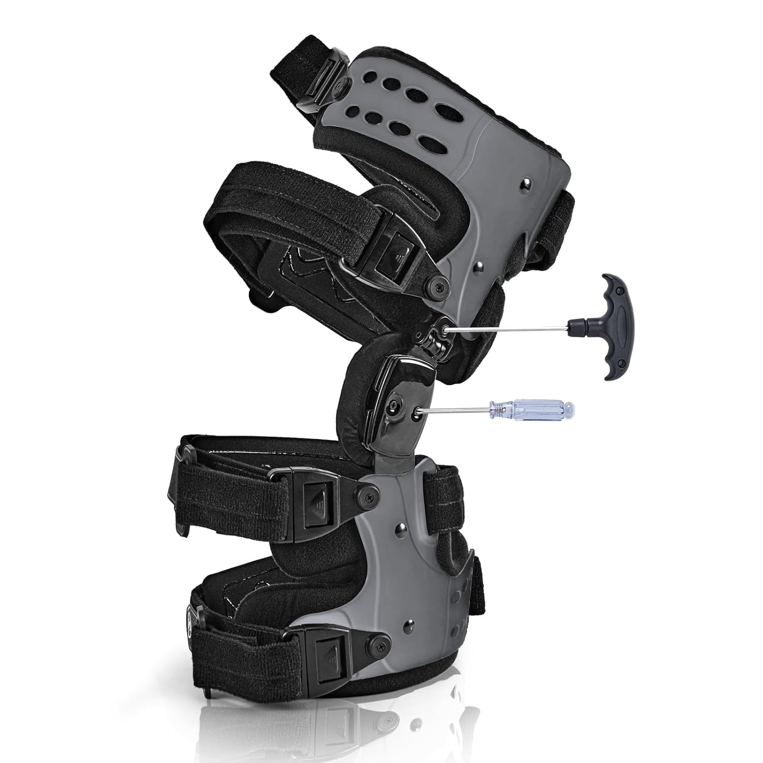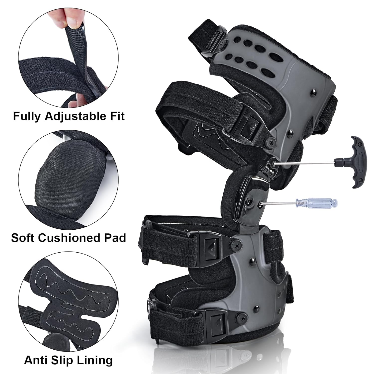 ????【Package includes】: OA Unloader Knee Brace*1, hillips screwdriver*1, hexagon wrench*1,anti-slip strap*1,extension /flexion pegs*13, screws*4, instructions *1