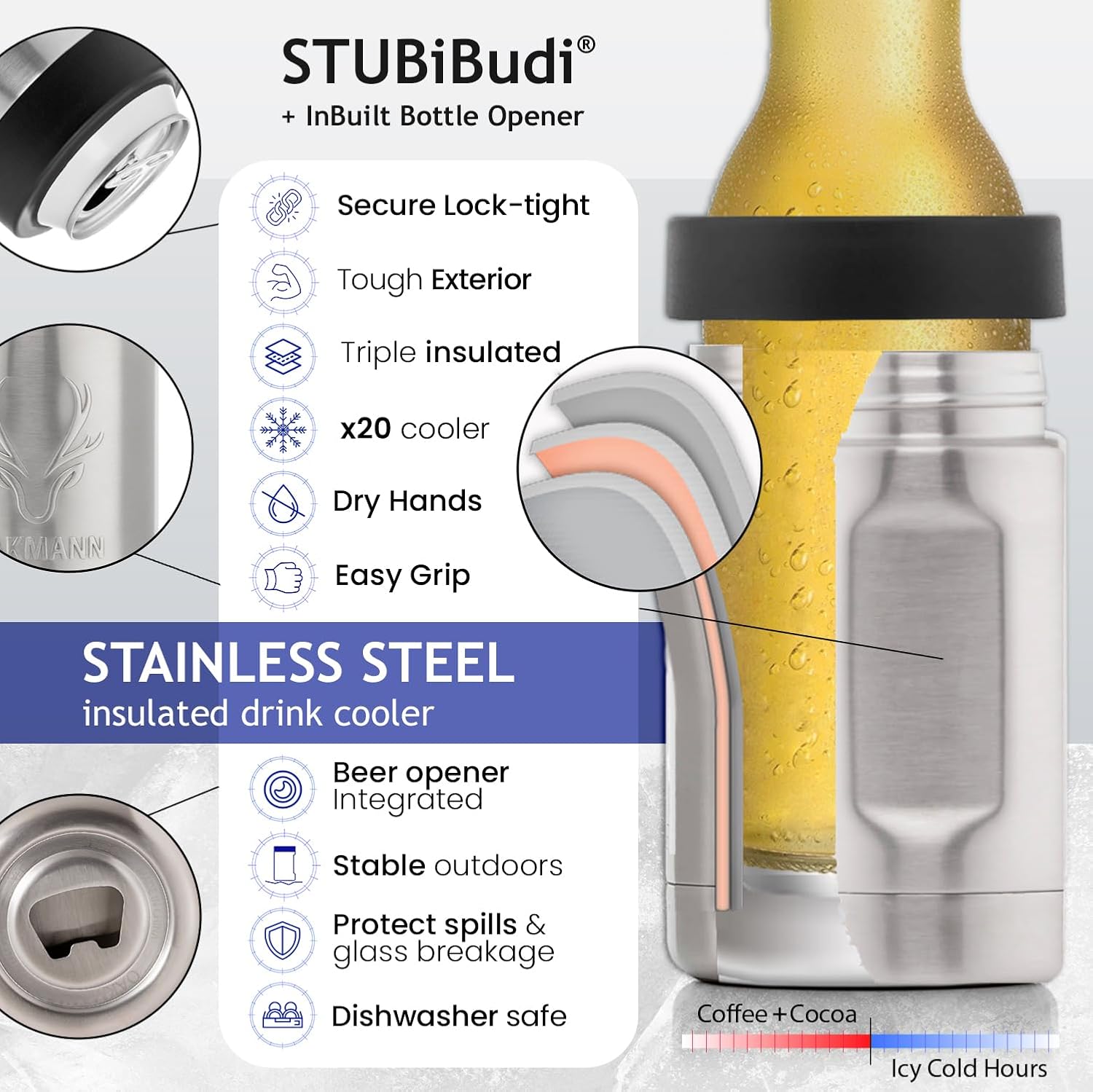 We use only high quality rust-proof anti-corrosion 304 stainless steel 18/8 for our triple wall, vacuum insulated, universal buddy can cooler. This ensures you get a leak-proof, sweat-proof, ice-cold experience every time.