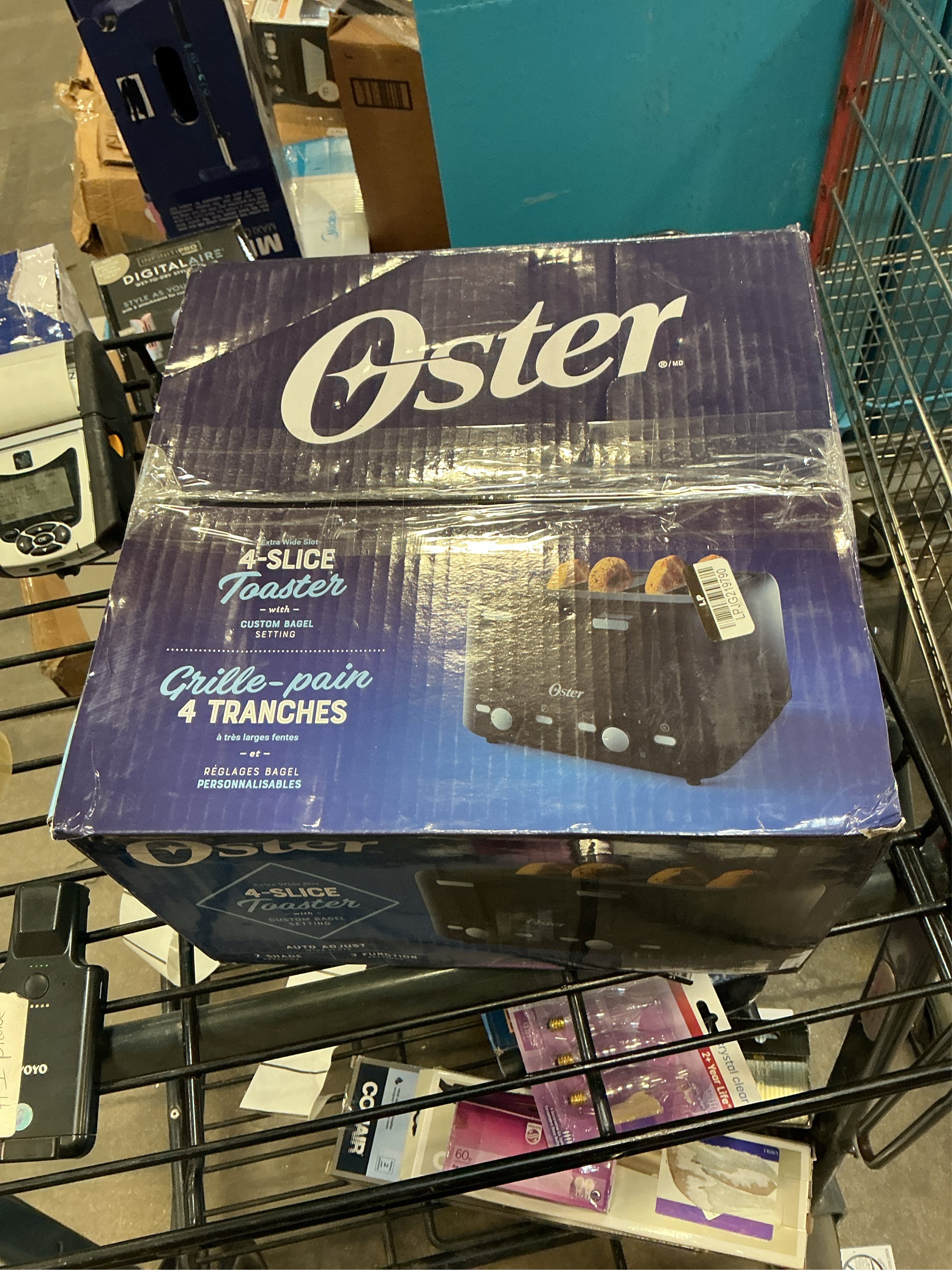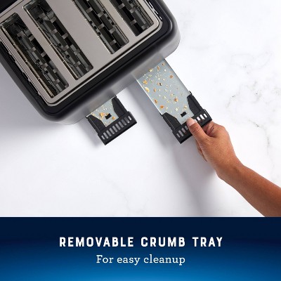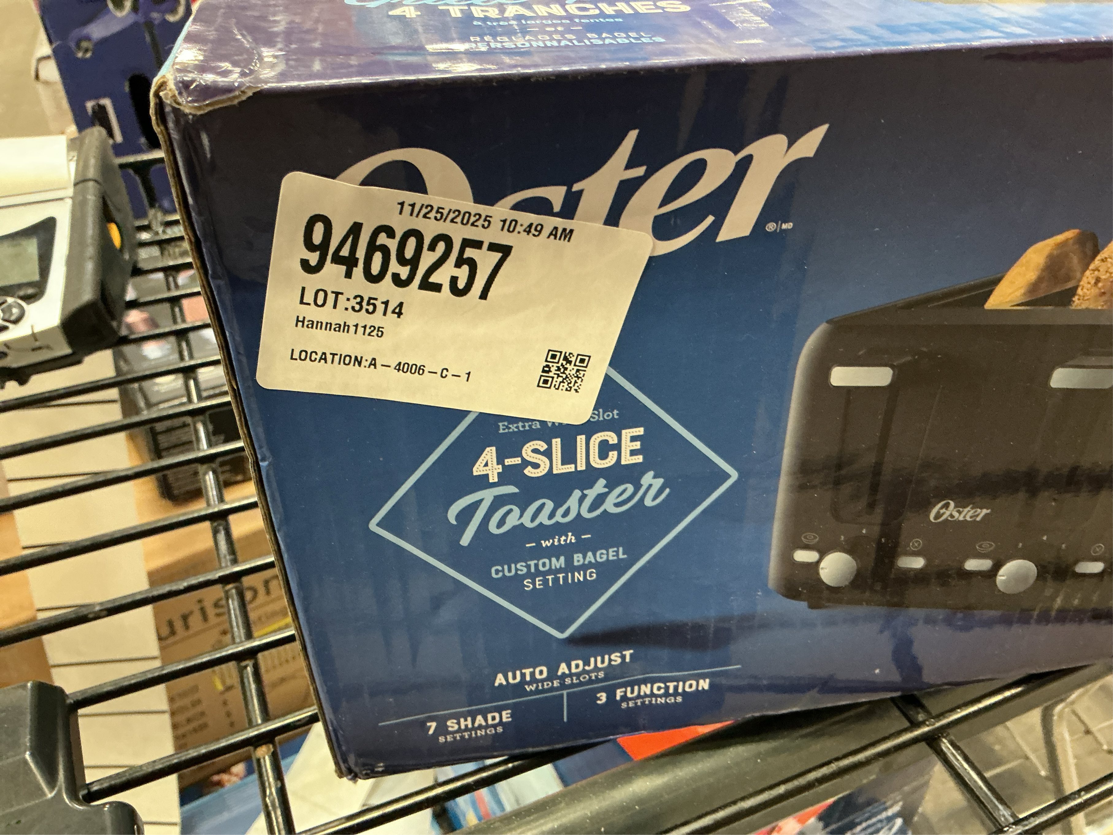 Start your day off right with the Oster® Extra-Wide Slot 4-Slice Toaster. Designed with a sleek black stainless steel finish that complements any kitchen and three function settings: bagel, reheat, and cancel. The custom bagel setting automatically adjusts toasting time to ensure bagels are toasted to perfection, while the reheat setting lowers toast back into the slots to reheat without re-toasting. Seven shade settings let you choose your ideal toasting shade from light to dark for the perfect shade and crispness. So easy to use and clean, there's a high-lift lever that elevates the bread for easier retrieval and a removable crumb tray that makes cleanup a breeze. Make every morning a little bit tastier with the Oster® Extra-Wide Slot 4-Slice Toaster.
