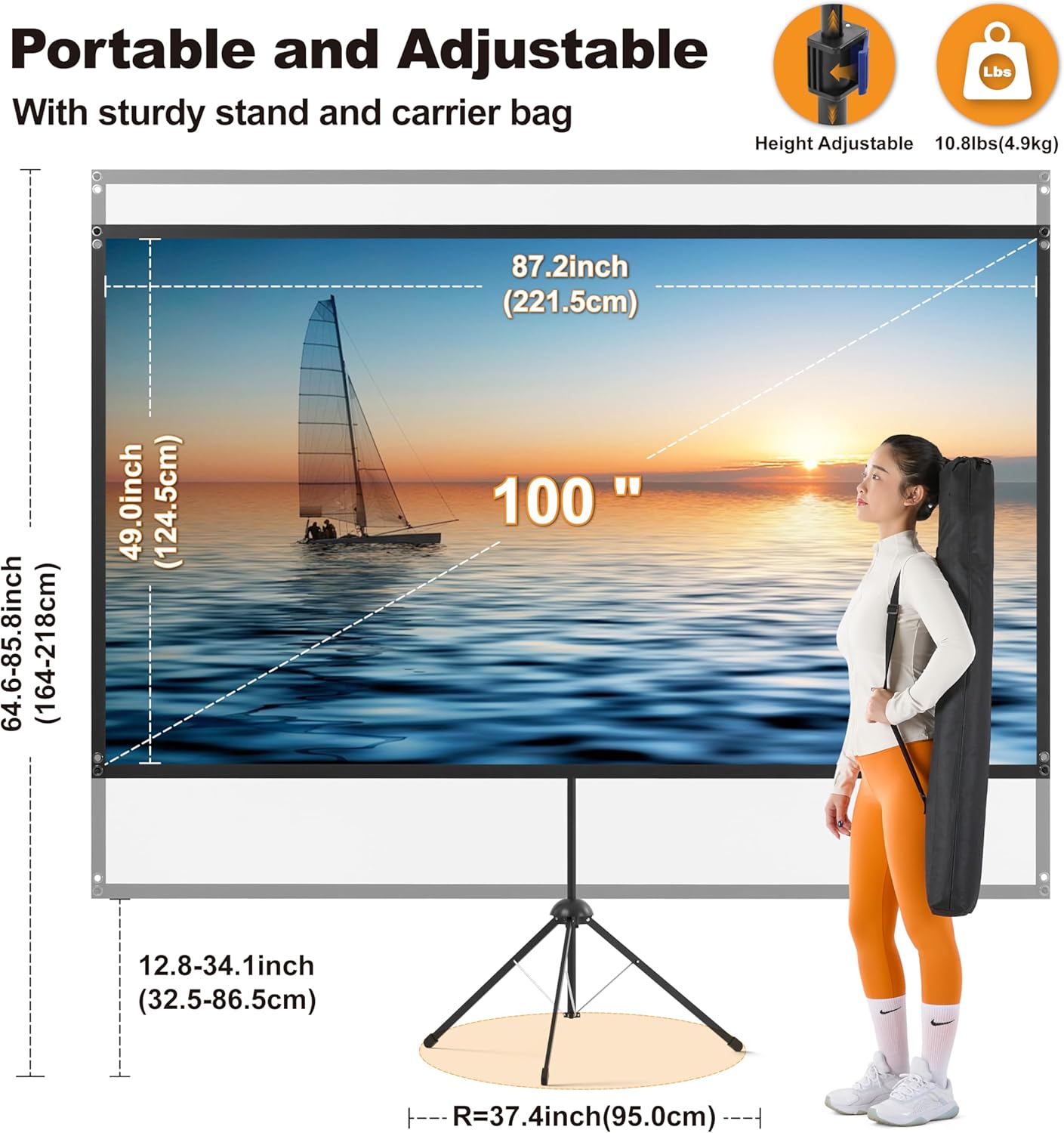 Outdoor Projector Screen 100 Inch, 16:9, High Gain, Projector Screen with Stand, Wind-resistant Design for Portable Projection Screen Outdoor, With Ropes and Spikes, 4K Image for Home Theater, Camping