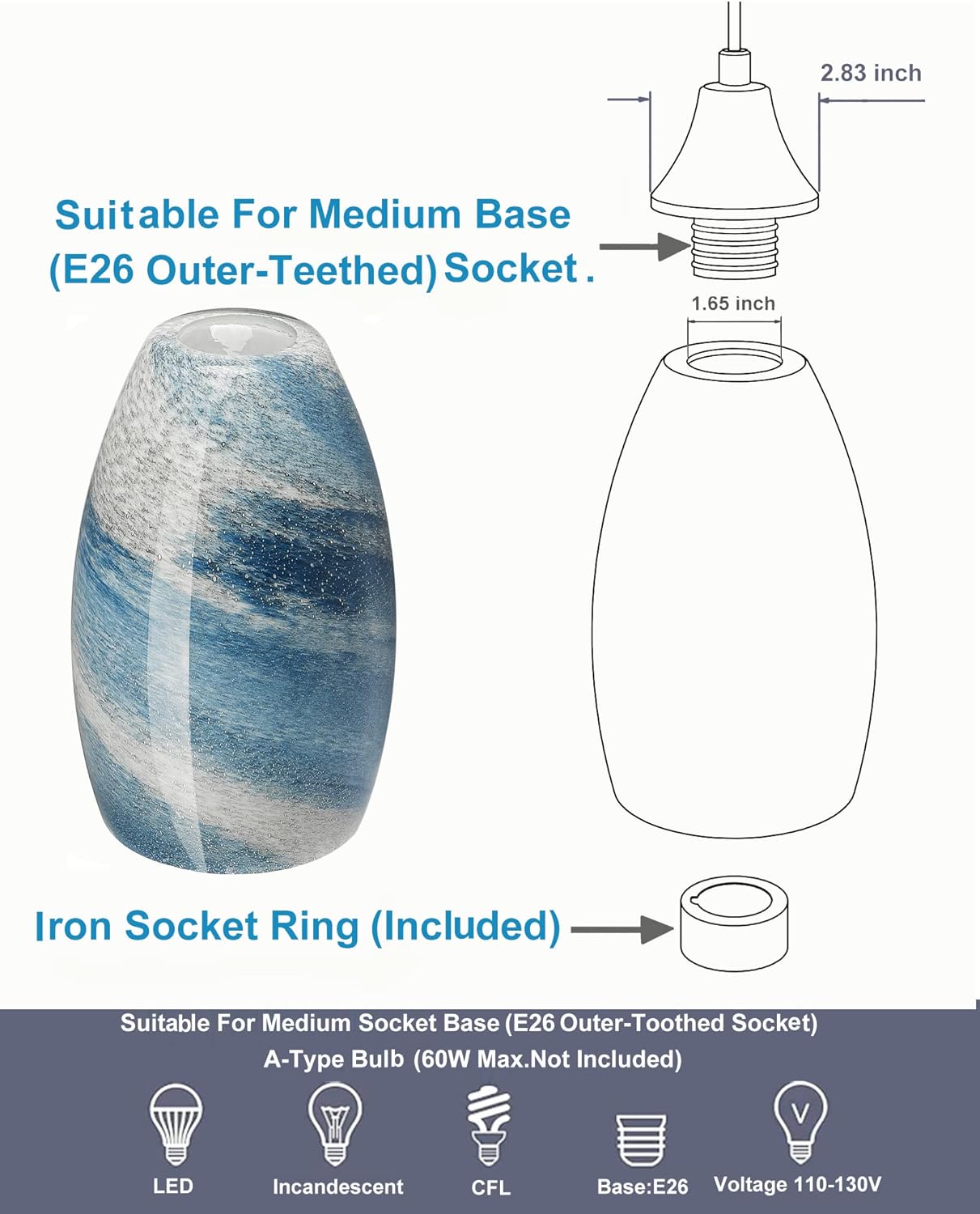 ·Easy to Install & Clean: The glass lampshade replacement no lip for the mounting screws to hold on, cannot be installed with screws, need socket ring to be fixed, which make it easily to install and remove to the light fixture. The glass shade and rim are smooth, its easy to clean.