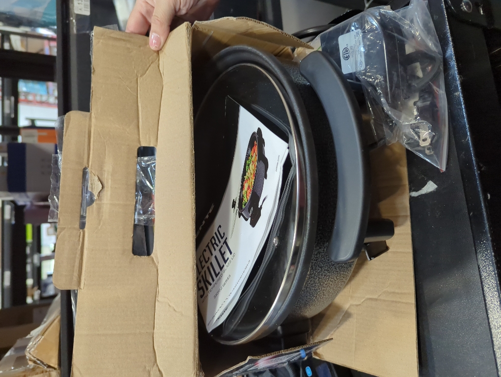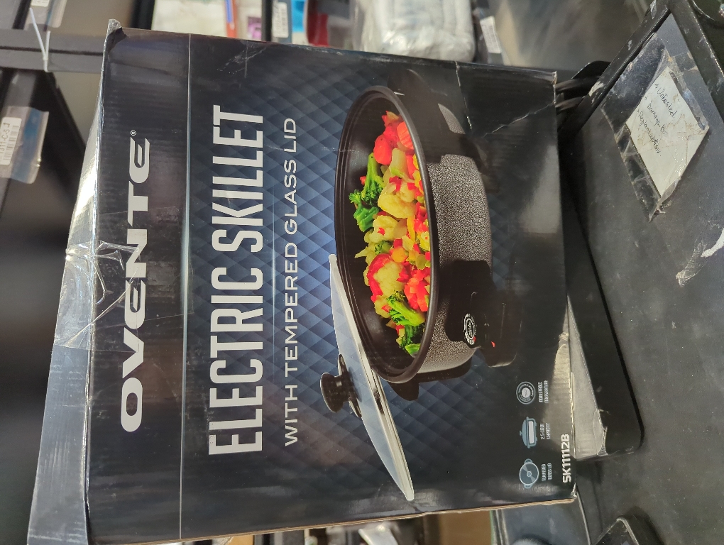 Surprise your friends and relatives with the OVENTE Electric Skillet as your perfect birthday, anniversary, Thanksgiving or Christmas gift. This must-have item is one of the most versatile small countertop appliances everyone should own. The ample 12" pan is made of premium components that lets you saute, braise, simmer, sear and scramble eggs quickly. Prepare hot and healthy meals for your entire family in minutes without using multiple pots or pans like sumptuous meats, vegetables, soups, chili, stir-fry, desserts and so much more. Features a variable-temperature knob with a 200-450°F degree range, as well as an indicator light to let you know when power is on and when the desired temperature is reached. Includes a glass lid that keeps moisture in and protects against splatters while preventing smell from escaping. This portable and multi-purpose product is built with cool-touch handles for safe transport. Allow the heating plate to cool down before cleaning, then simply wipe it with a clean and slightly damp cloth or sponge. Carefully remove all detachable parts before storing and avoid direct contact with metal or sharp objects. Non-stick coating quickly releases food and enables easy cleaning. Features cool-touch handles for enhanced safety. Automatic temperature control to maintain temperature settings. HASSLE-FREE COOKING - Cook your way from breakfast to dinner and everything in between. Powered by 1400-watts and made of high-quality aluminum body that conducts heat well for efficient, faster and better cooking. ADJUSTABLE TEMPERATURE - Brush the skillet with a little cooking oil, then select the right heat setting based on your needs. The removable probe with easy-to-use dial lets you adjust the temperature to create a variety of perfectly delicious dishes. SPACIOUS - The 12-inch size is big enough for making stew, sauce and stir-fry meals. Whether you're making a family favorite or trying new recipes, our electric skillet can do it all, like omelets, risottos, ratatouilles, paellas, tomato sauce with meatballs; the list is endless. LOCK IN FLAVORS - Comes with a tempered glass cover that can handle high temperature and steam without breaking. It allows you to view cooking progress, while it seals and conserves heat and flavor. CONVENIENT AND SAFE - The non-stick surface makes cooking and clean-up easier. Has cool-touch handles to secure grip and protect your hands from getting burned. Once the meal is ready, remove the probe and serve your cooked meals straight from the kitchen to your dining table safely with no worry. Appliance Series: Not Applicable. Appliance Type: Electric Skillet. Color/Finish: Black. Color/Finish Family: Black. Commercial Use: Residential. Cooking Area (sq. in.): 113. Features: Adjustable Thermostat, Automatic Shut-Off, Cool-Touch Handles, Non-Stick Surface, Power On Light Indicator, Removable Lid. Includes: No Additional Items. Material: Aluminum. Number of Pieces: 1. Number of Temperature/Cooking Controls: 5. Pan Shape: Circle. Product Weight (lb.): 4.6 lb. Small Appliances Color Family: Black. Small Electric Product Type: Electric Skillet. Style: Modern. Wattage (W): 1400 W. Certifications and Listings: Certified Listed. Product Depth (in.): 11.5 in. Product Height (in.): 4 in. Product Width (in.): 13.5 in.