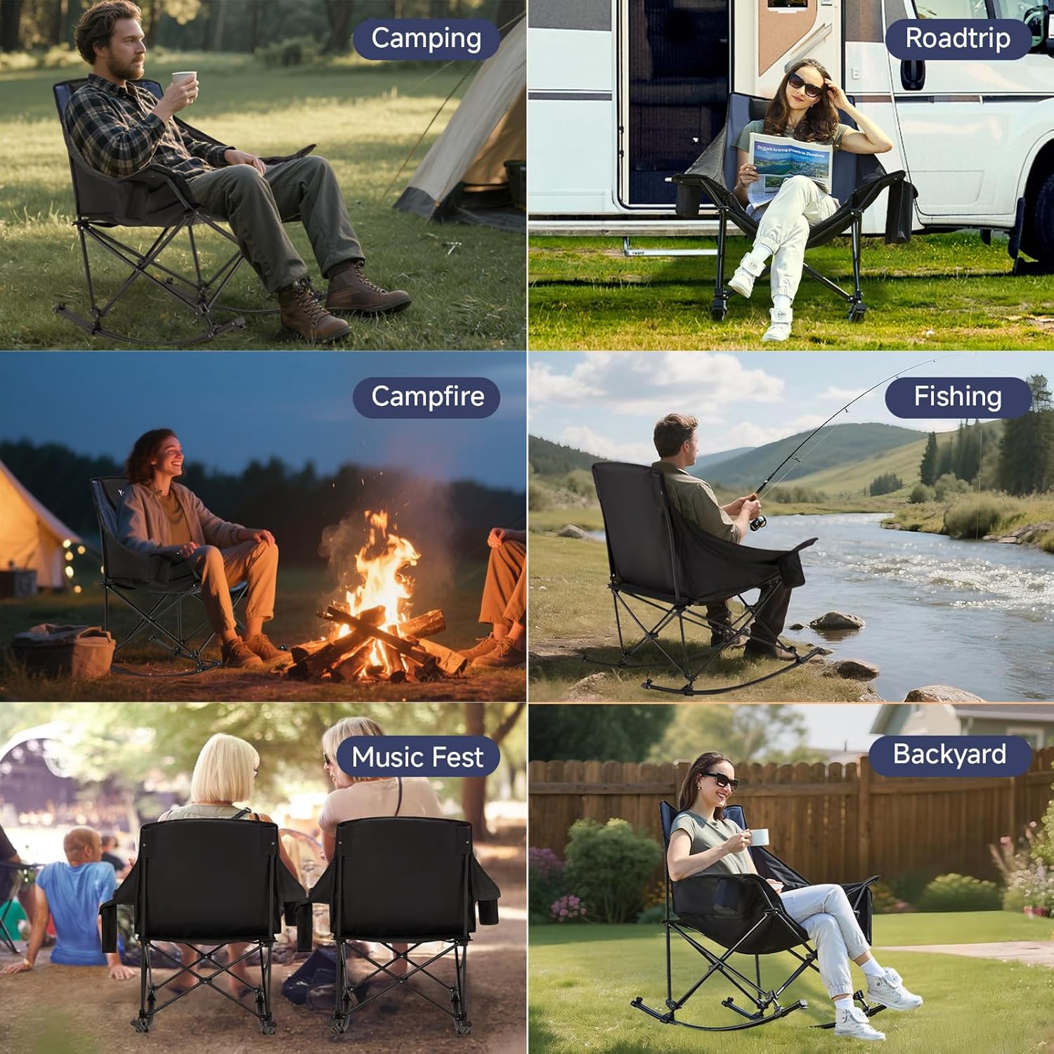 Oversized Folding Rocking Camping Chair, Padded Portable Rocking Chair with Pockets, Cup Holder and Carry Bag, Heavy Duty Outdoor Rocker Patio Chair for Garden, Lawn, Up to 400lbs, Navy Blue