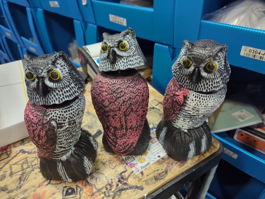 Premium Quality. The fake owl is painted with delicate non-fading and water-proof paint in surface by hand. The scarecrow consists of sturdy molded plastic, So the plastic owl can protect your garden plants flowers outside all kinds of weather conditions.