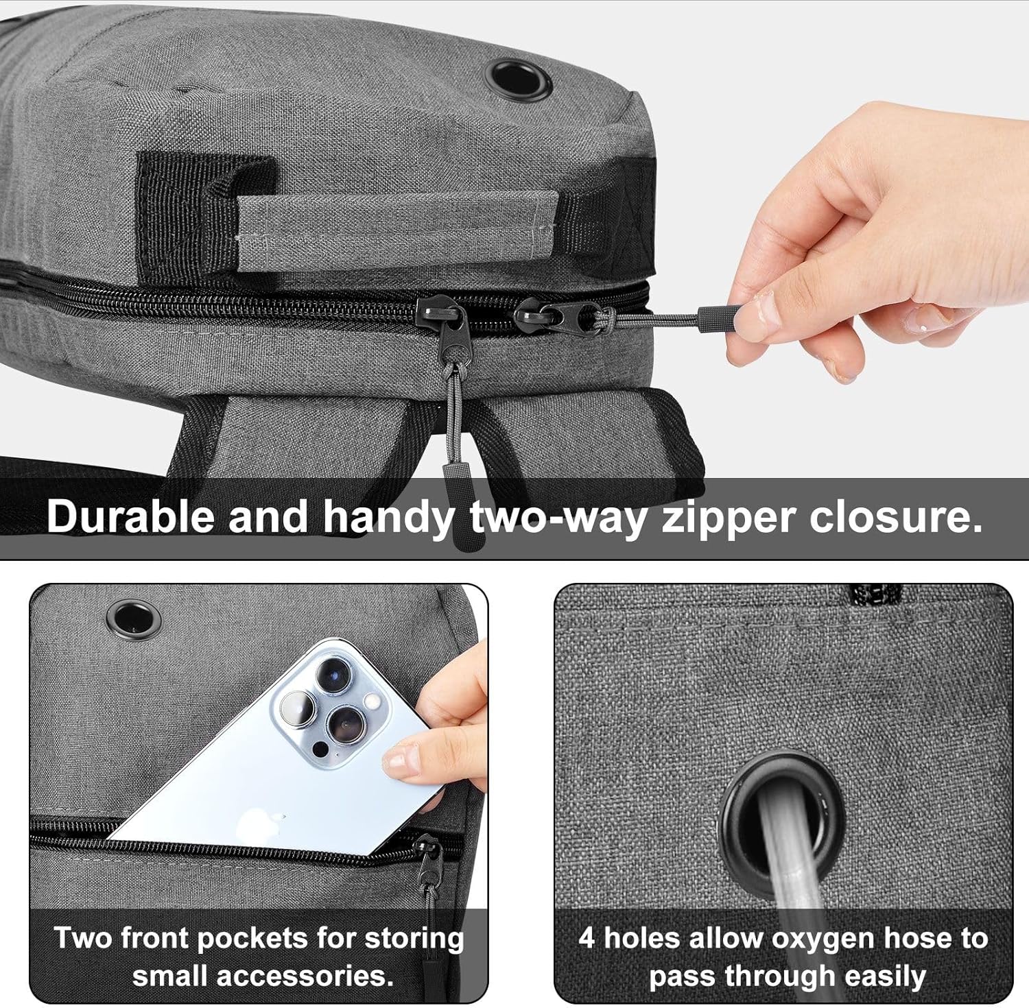 Four Hose Outlets: We specially designed 4 small holes allow you to pass the oxygen hose through easily and reasonably, preventing it from getting tangled and knotted when you use it. The two-way zipper closure design is very convenient to open and close the d tank oxygen bag.