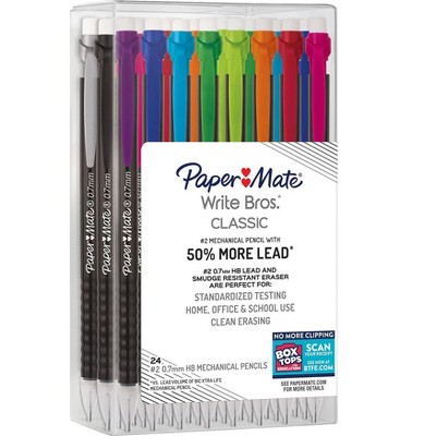 With 50% more lead, Paper Mate Write Bros. Classic mechanical pencils help you spend more time writing and less time at the pencil sharpener. Meanwhile, a smudge-free eraser keeps your writing clean. Finally, the No.2 pencil lead makes these mechanical pencils ideal for standardized testing. They're great for fast-paced home, office, and school use. Mechanical pencils are ready to use right out of the box and are great for standardized testing. 0.7mm hard lead ensures clear and visible lines. Black tube-shaped barrels. 24 pencils per box. Features convenient pocket clips in assorted colors. Built-in eraser allows you to correct mistakes and make changes anytime. Retractable mechanism allows you to use the lead when you need it and keep it from breaking when you don't. Comfortable grip zone for superior control. Mechanical pencils are ready to use right out of the box and are great for standardized testing. 0.7mm hard lead ensures clear and visible lines. Black tube-shaped barrels. 24 pencils per box. Features convenient pocket clips in assorted colors. Built-in eraser allows you to correct mistakes and make changes anytime. Sold as 24/Box.