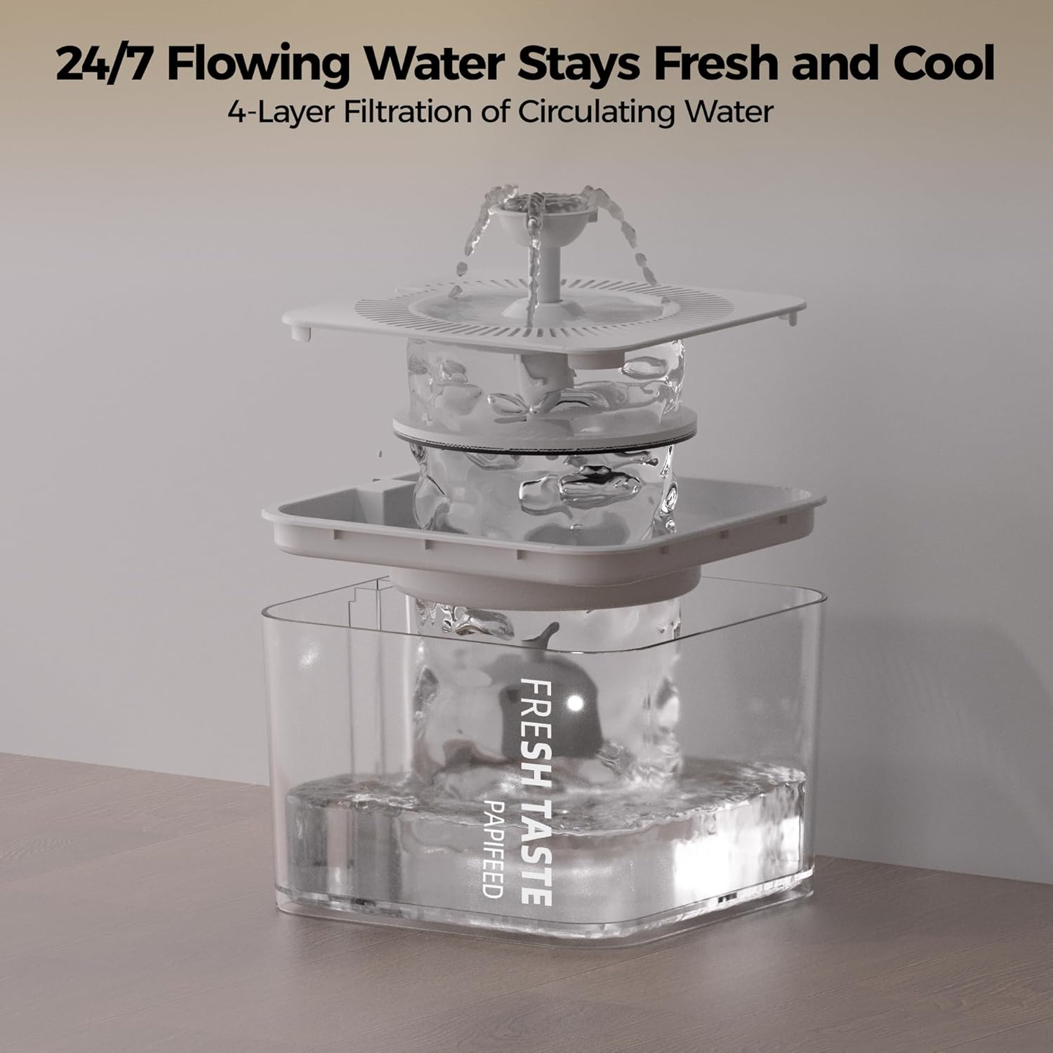Healthy Circulating Filtration for Fresh Water: The pet water fountain features triple filtration, easily removing impurities and odors to keep the water fresh. The upgraded low-noise pump ensures quiet operation. With a 3L capacity and recessed design, it continues to function even during short power outages, so you don't need to worry about your pet's water supply