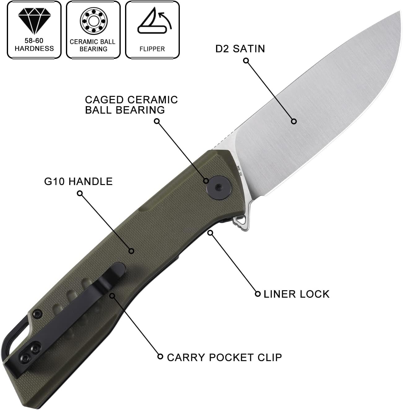【Outdoor Folding Knife Materials】The blade is made of D2 tool steel with high wear resistance. After heat treatment, its hardness can reach 60HRC. It is a kind of steel suitable for practical use, which can meet any needs of people when camping or working. The handle is G10 material with strong anti-deformation ability. It does not absorb water and will not be affected by moisture, so you never have to worry about the influence of water on the handle.