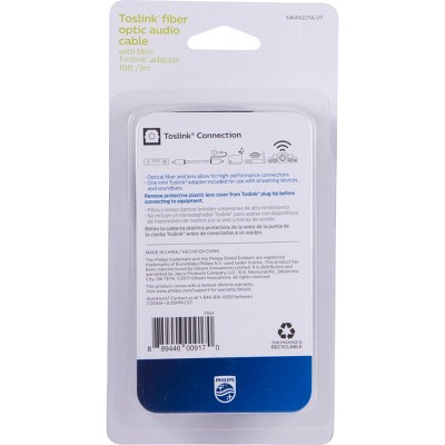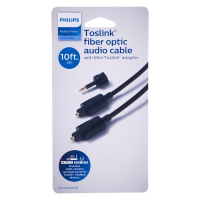 Give your home entertainment system a boost with the Philips 10ft. Toslink® Fiber Optic Audio Cable with Mini Adapter. This quality cable transmits superior high-definition surround sound between AV components with fiber optic inputs (TOSLINK). Rediscover your favorite movies, music and video games with fully rendered, crystal-clear surround sound from a superior audio signal. The optical fiber and lens allow you to experience the best possible performance – all without compromising sound quality.